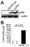Figure S9 Overexpression of EphB1DK in SW620 cells enhances Akt and Wnt activities. SW620 cells were transfected with an empty vector or a plasmid encoding HA-tagged EphB1DK, and western blotting (A) or TOP/FOPFLASH luciferase activity assay (B) was carried out for cell lysates. Cells transfected with a plasmid encoding caAkt were used as a positive control in A. Unpaired t test was performed to compare Wnt activity in B, and error bars represent standard deviation. |