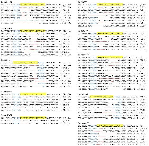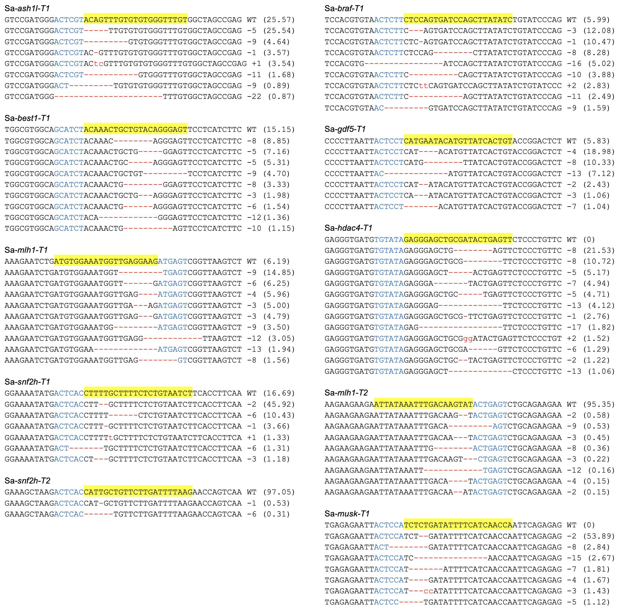 Fig. S1. DNA deep-sequencing data show the mutations induced by SaCas9 targeting the genes showed in Fig. 2a. For all the panels, the wild-type sequence is shown at the top with the target site highlighted in yellow and the PAM sequence in blue text. Red dashes indicate deletions and lowercase letters in red indicate insertions or mutations. The numbers in parentheses show the percentage of this sequence in total sequencing reads. For target site designation, the gene name is in the middle, the prefix Sa- represents SaCas9. The suffixes -T1 and -T2 represent the first and the second target site designed in a given gene, respectively. |