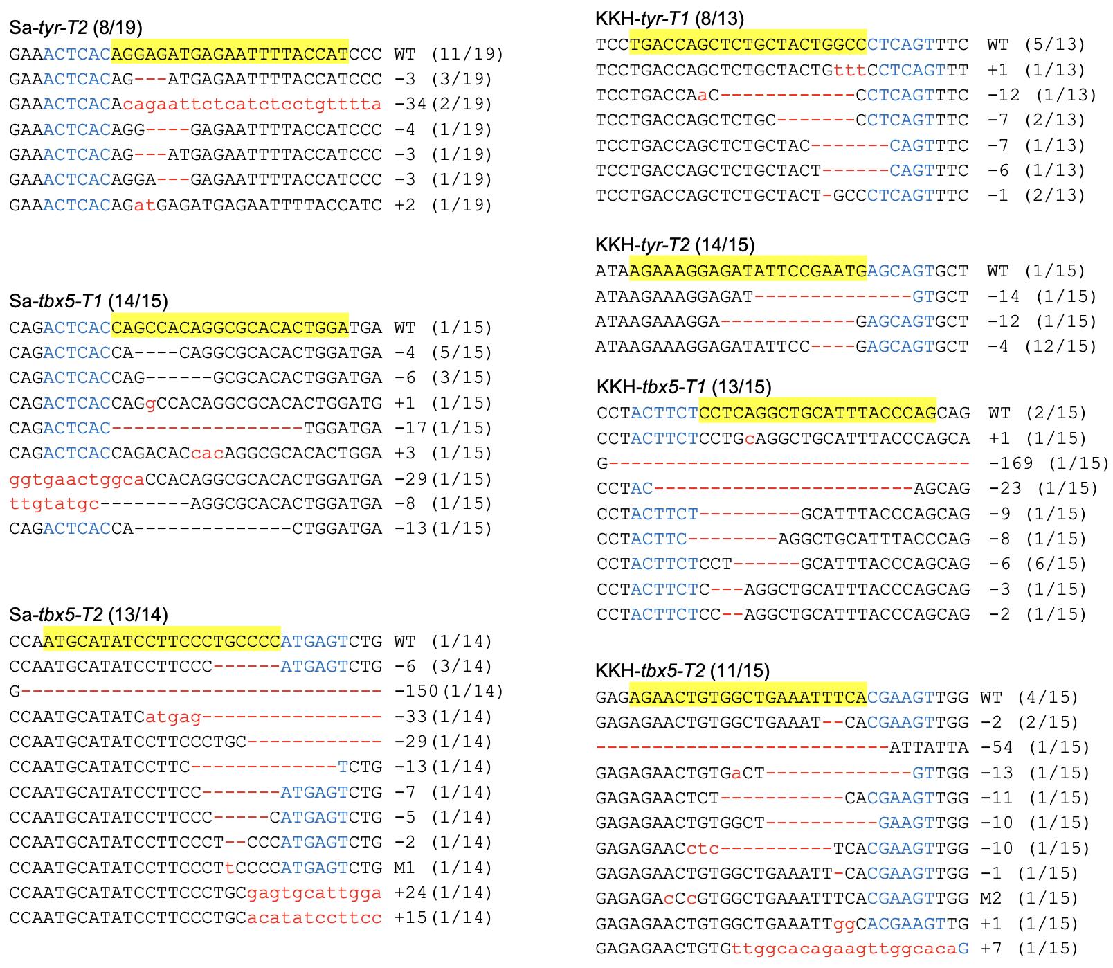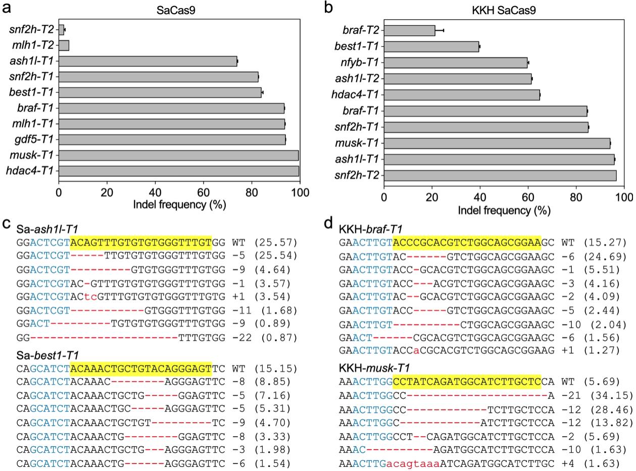 Figure 2. SaCas9 and KKH SaCas9 are efficient and robust tools for genome editing in X. tropicalis. a SaCas9 induced efficient targeted gene disruption in X. tropicalis embryos. b KKH SaCas9 induced efficient targeted gene disruption in X. tropicalis embryos. c, d Deep-sequencing data show some of the mutations induced by SaCas9 and KKH SaCas9. For all the panels, the wild-type sequence is shown at the top with the target site highlighted in yellow and the PAM sequence in blue text. Red dashes indicate deletions and lowercase letters in red indicate insertions or mutations. The numbers in parentheses show the percentage of this sequence in the total sequence reads. For target site designation, the gene name is in the middle, the prefixes Sa- and KKH- represent SaCas9 and KKH SaCas9, respectively. The suffixes -T1 and -T2 represent the first and the second target site designed in a given gene, respectively |