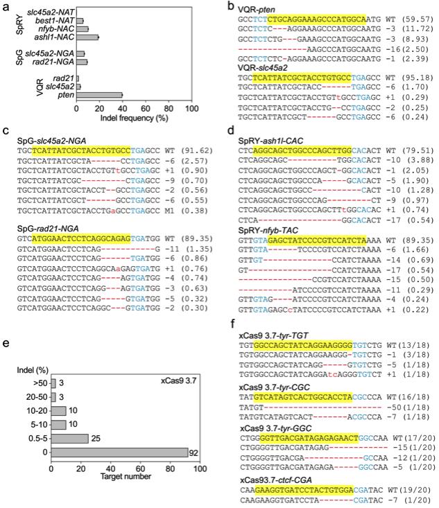 Figure 3. VQR Cas9, SpG Cas9, SpRY Cas9 and xCas9 3.7 have limited genome editing efficacy in X. tropicalis. a VQR Cas9, SpG Cas9, and SpRY Cas9 induced indel frequency in X. tropicalis embryos, as detected by deep-sequencing. bâd Some of the deep-sequencing data show the mutations induced by VQR Cas9, SpG Cas9, and SpRY Cas9. The wild-type sequence is shown at the top with the target site highlighted in yellow and the PAM sequence in blue text. Red dashes indicate deletions and lowercase letters in red indicate insertions or mutations. For all panels, the numbers in parentheses show the percentage of this sequence in the total sequence reads. e Summary of the xCas9 3.7 targeted genome-editing efficiency based on gray value analyses of the T7EI data. f DNA sequences show xCas9 3.7 induced mutations, as detected by Sanger DNA sequencing. For each panel, the wild-type sequence is shown at the top with the target site highlighted in yellow and the PAM sequence in blue text. Red dashes indicate deletions and lowercase letters in red indicate insertions or mutations. The numbers in parentheses represent the ratio of this sequence in the total colonies sequenced. For target site designation, in addition to the gene name, the name of the Cas9 variant is used as a prefix and in some cases the PAM motif is indicated as a suffix |