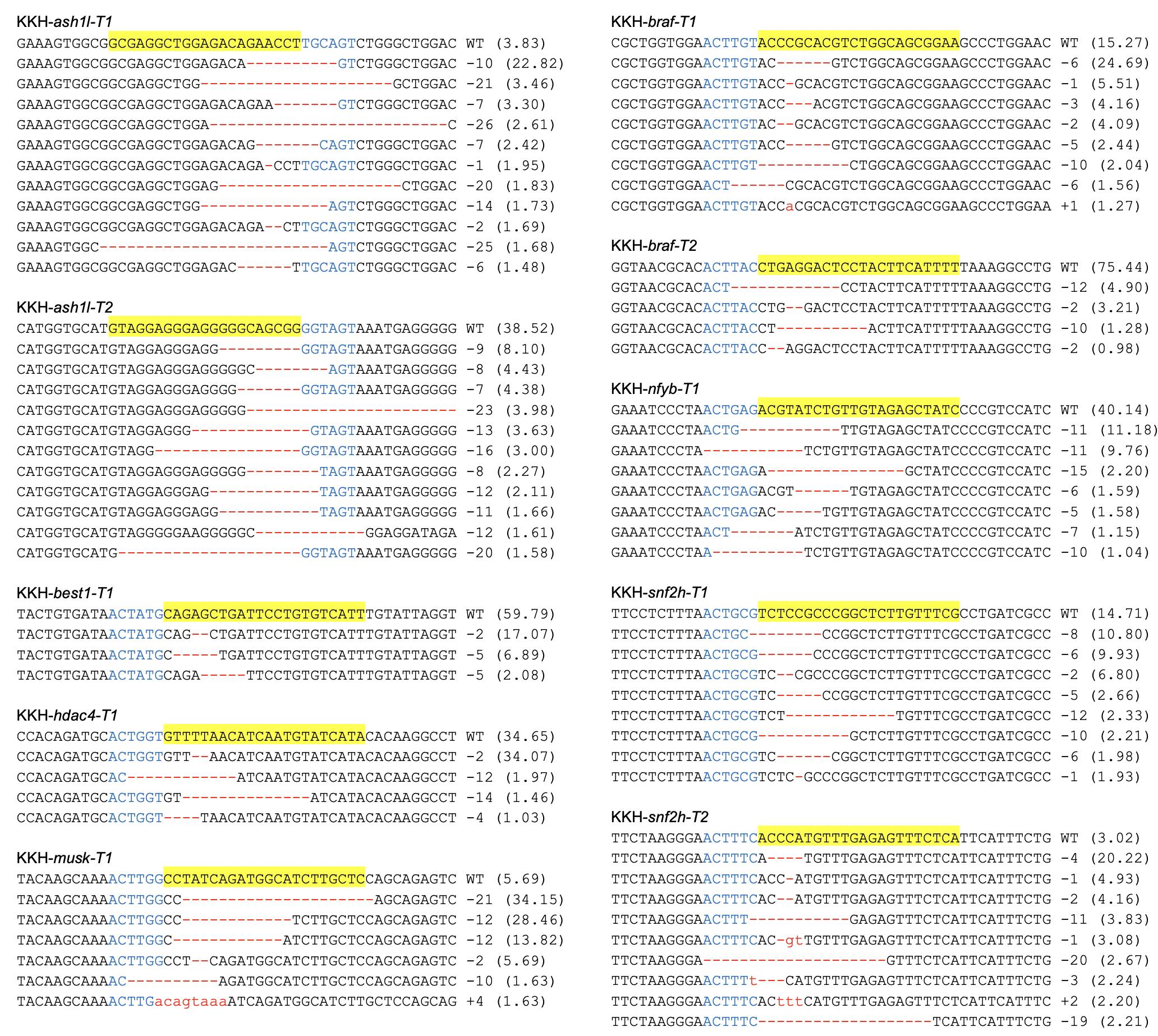 Fig. S2. DNA deep-sequencing data show the mutations induced by KKH SaCas9 targeting the genes showed in Fig. 2b. For all the panels, the wild-type sequence is shown at the top with the target site highlighted in yellow and the PAM sequence in blue text. Red dashes indicate deletions and lowercase letters in red indicate insertions or mutations. The numbers in parentheses show the percentage of this sequence in total sequencing reads. For target site designation, the gene name is in the middle, the prefix KKH- represents KKH SaCas9. The suffixes -T1 and - T2 represent the first and the second target site designed in a given gene, respectively. |