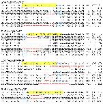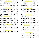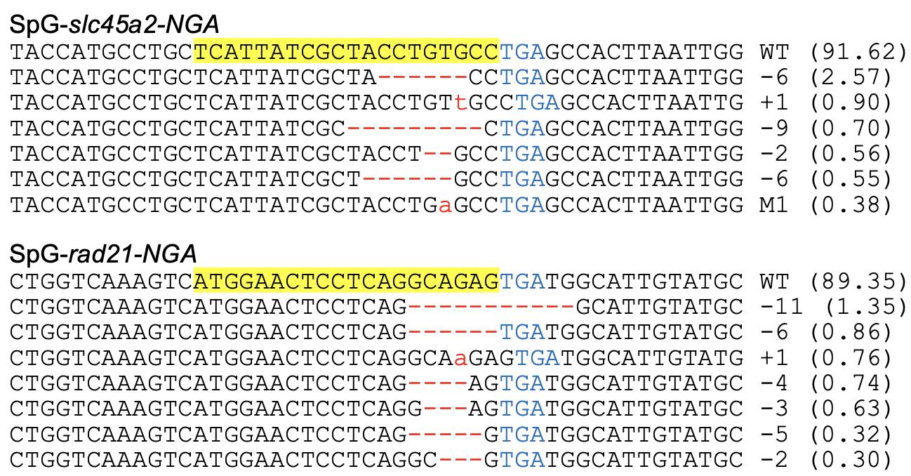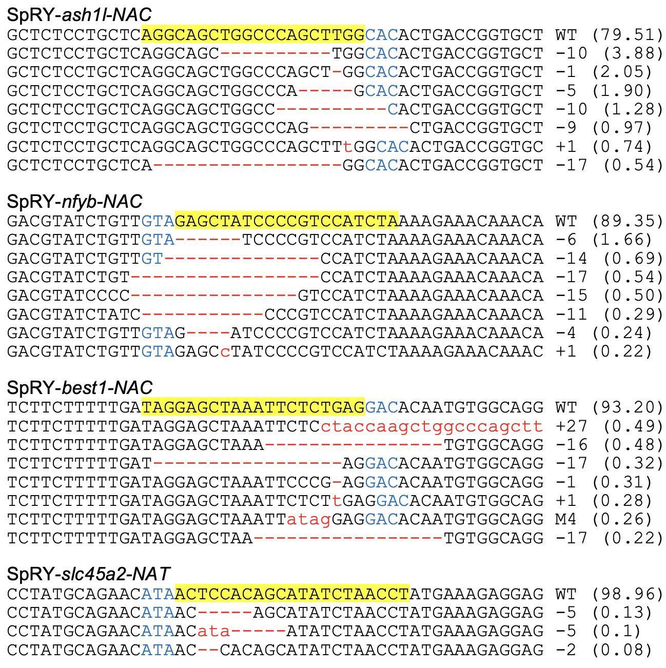 Fig. S6. DNA deep-sequencing data show the mutations induced by SpRY Cas9 targeting the genes showed in Fig. 3a. For all the panels, the wild-type sequence is shown at the top with the target site highlighted in yellow and the PAM sequence in blue text. Red dashes indicate deletions and lowercase letters in red indicate insertions or mutations. The numbers in parentheses show the percentage of this sequence in total sequencing reads. For target site designation, in addition to the gene name, the name of the Cas9 variant is used as a prefix and the PAM motif is indicated as a suffix. |