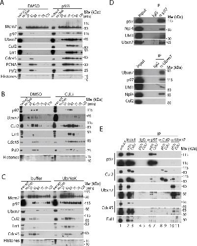 Figure 4. Regulation of Ubxn7 chromatin binding.A, p97 and Ubxn7 accumulate on chromatin upon p97 activity inhibition. Interphase egg extract was supplemented with DMSO or p97i and chromatin was isolated during the replication reaction. Chromatin samples were analyzed as in Figure 1A. Representative experiment is presented here and quantification over n = 3 in Fig. S4A. B, p97 and Ubxn7 decrease on chromatin upon cullin activity inhibition. Interphase egg extract was supplemented with DMSO or CULi and chromatin was isolated during the replication reaction. Chromatin samples were analyzed as in (A). Representative experiment is presented here and quantification of n = 4 in Fig. S4B. C, p97 and Ubxn7 accumulate on chromatin upon inhibition of polyubiquitylation. Interphase egg extract was supplemented with LFB1/50 buffer or 6HIS-UbiNoK and chromatin was isolated during the replication reaction. Chromatin samples were analyzed as in (A). Representative experiment is presented here and quantification of n = 3 in Fig. S4C. D, Ubxn7 interacts with p97 but not with Cul2 in egg extract. Ubxn7 or p97 were immunoprecipitated from egg extract. Interacting partners were analyzed by Western blotting with indicated antibodies. E, interaction between Ubxn7, p97, and Cul2 is disrupted when neddylation of Cul2 is inhibited. Interphase egg extract was supplemented with CULi (MLN4924) or p97i (NMS873). Chromatin was isolated in late S-phase when a high level of post-termination replisomes accumulated on chromatin, protein complexes were released from chromatin by Benzonase treatment and p97, Cul2, or Ubxn7 immunoprecipitated from the chromatin proteome. Immunoprecipitated samples were analyzed by Western blotting with indicated antibodies. Short and long exposures for each of the immunoprecipitated proteins are presented. DMSO, dimethyl sulfoxide. |