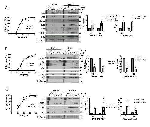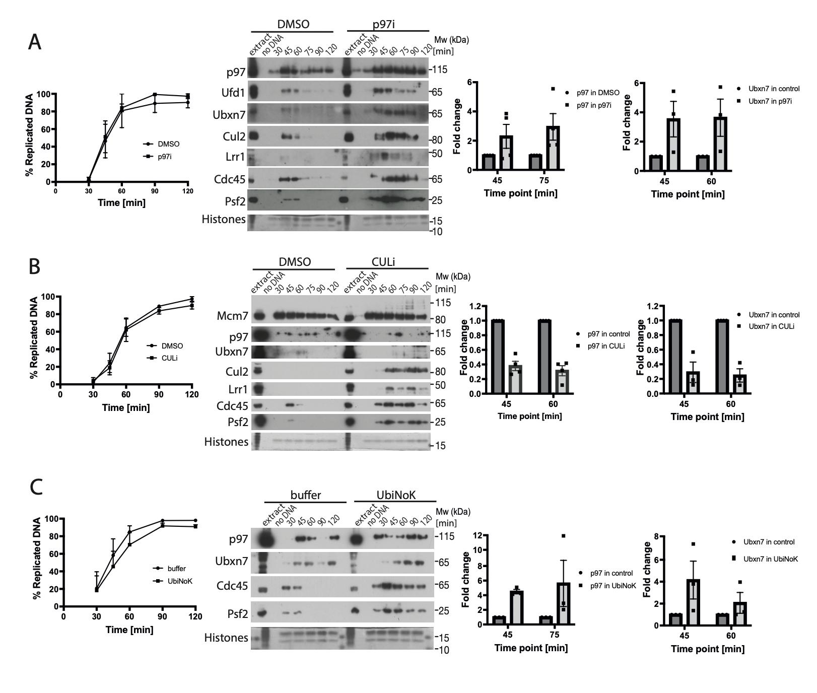 Supplementary Figure 4. (A) Addition of p97i to egg extract does not affect extractâs ability to synthesise DNA. Interphase egg extract was supplemented with DMSO or p97i and the incorporation of α32P-dATP into newly synthesised DNA was measured at indicated times. Mean of n=2 for p97i with SEM. p97 and Ubxn7 accumulate on chromatin upon p97i treatment. An alternative experiment presented to the one in Figure 4A. The level of p97 and Ubxn7 bound to chromatin at 45, 60 or 75 min was quantified in DMSO and p97i treated extract. 45 min timepoint represents time when replisomes are present on chromatin in control and treatment sample, while at 60/75 min replisomes are mostly unloaded in control sample. Fold increase in p97i over control is presented as a mean value with individual value points (n=4 for p97 and n=3 for Ubxn7). (B) Addition of CULi to egg extract does not affect extractâs ability to synthesise DNA. Interphase egg extract was supplemented with DMSO or CULi and the incorporation of α32P-dATP into newly synthesised DNA was measured at indicated times. Mean of n=4 with SEM. p97 and Ubxn7 decreased on chromatin upon CULi treatment - quantification of an experiment in Figure 4B as above (n=4). (C) Addition of 6His-UbiNOK to egg extract does not affect extractâs ability to synthesise DNA. Analysed as above. Quantification of p97 and Ubxn7 accumulation on chromatin upon 6HIS-UbiNOK treatment as in Figure 4C (n=3). |