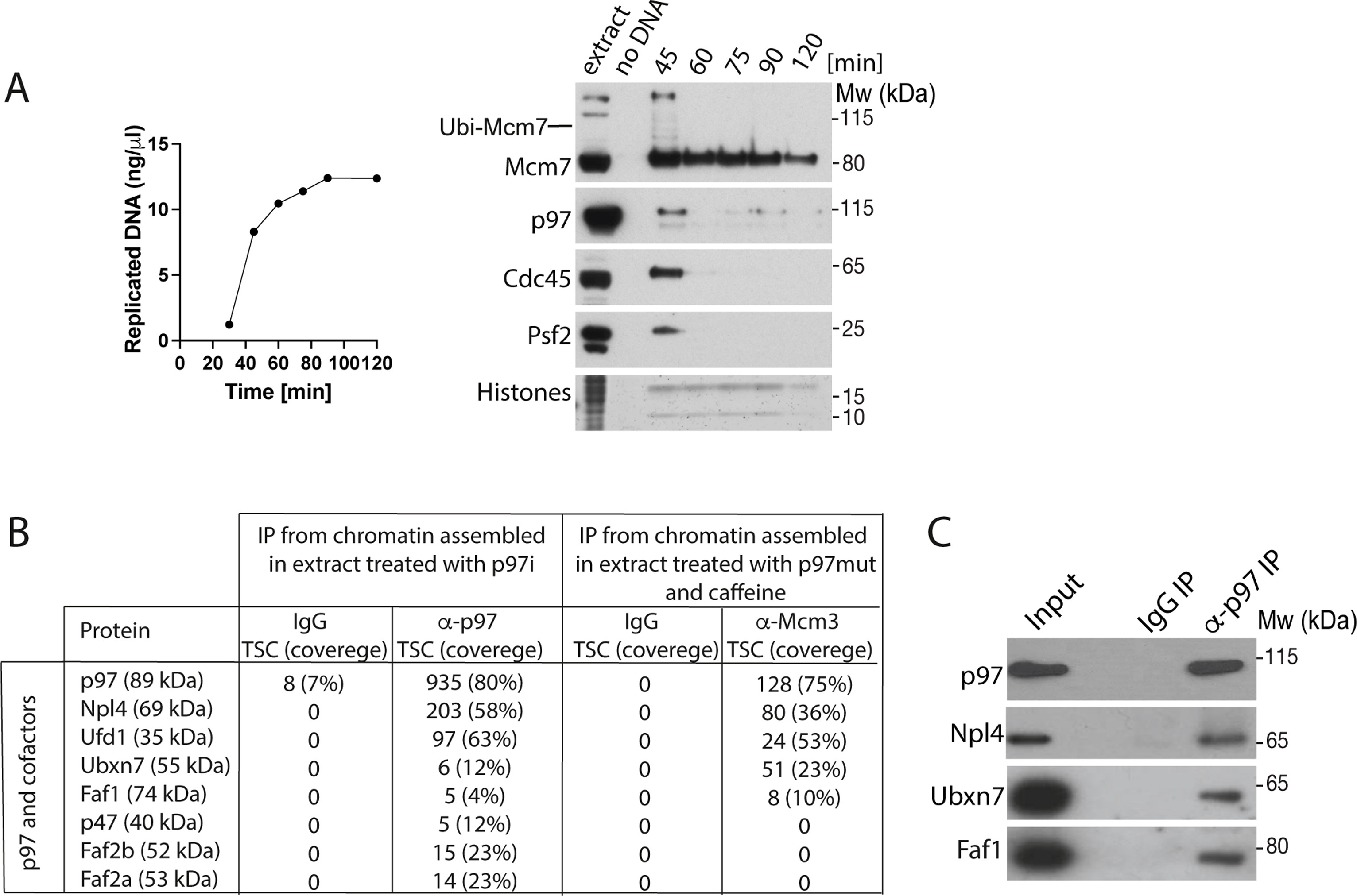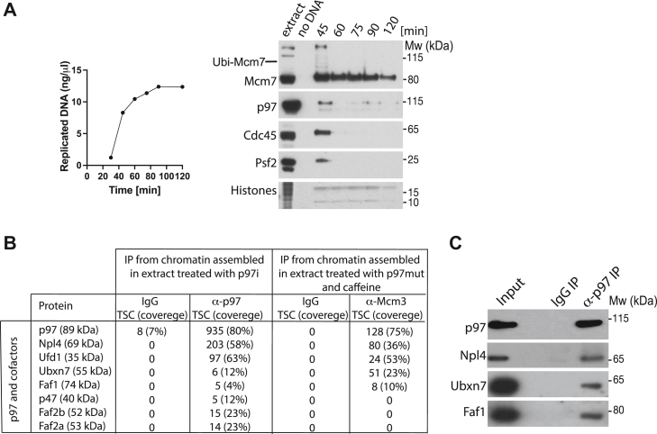 Figure 1. Cofactors interacting with p97 on replicating chromatin in Xenopus laevis egg extract. (A) Chromatin binding of p97 follows replication fork components. A replication reaction was set up in X. laevis egg extract and synthesis of nascent DNA was followed by incorporation of radioactive α-P32dATP into newly synthesised DNA (left). At the same time, chromatin was isolated during the replication reaction at indicated time points after sperm DNA addition. Sample without DNA addition was processed in parallel to provide a chromatin specificity control. Histones at the bottom of the PAGE gel were stained with Colloidal Coomassie for loading and sample purity control. Chromatin samples were analysed by western blotting with indicated antibodies (right). (B) Ubxn7 and Faf1 are identified as cofactors interacting with both p97 and terminated replisome. Interphase egg extract was supplemented with p97i (NMS873) and chromatin was isolated in late S-phase when high levels of terminated replisomes are accumulated on chromatin. Protein complexes were released from chromatin by Benzonase treatment and proteins interacting with p97 segregase were analysed by mass spectrometry. Identified putative interactors were screened to find known and potential p97 cofactors. Obtained data was compared with the mass spectrometry results of interactors of terminated replisomes published previously (4). Total spectral count is presented with protein coverage in the brackets. Only p97 and its cofactors are presented. Other proteins identified in p97 IP are included in Supplementary Table 1. (C) Verification of p97 interaction with Ubxn7 and Faf1 on chromatin. A small proportion of input and immunoprecipitated sample from p97 IP described in (B) was analysed by western blotting with indicated antibodies. |