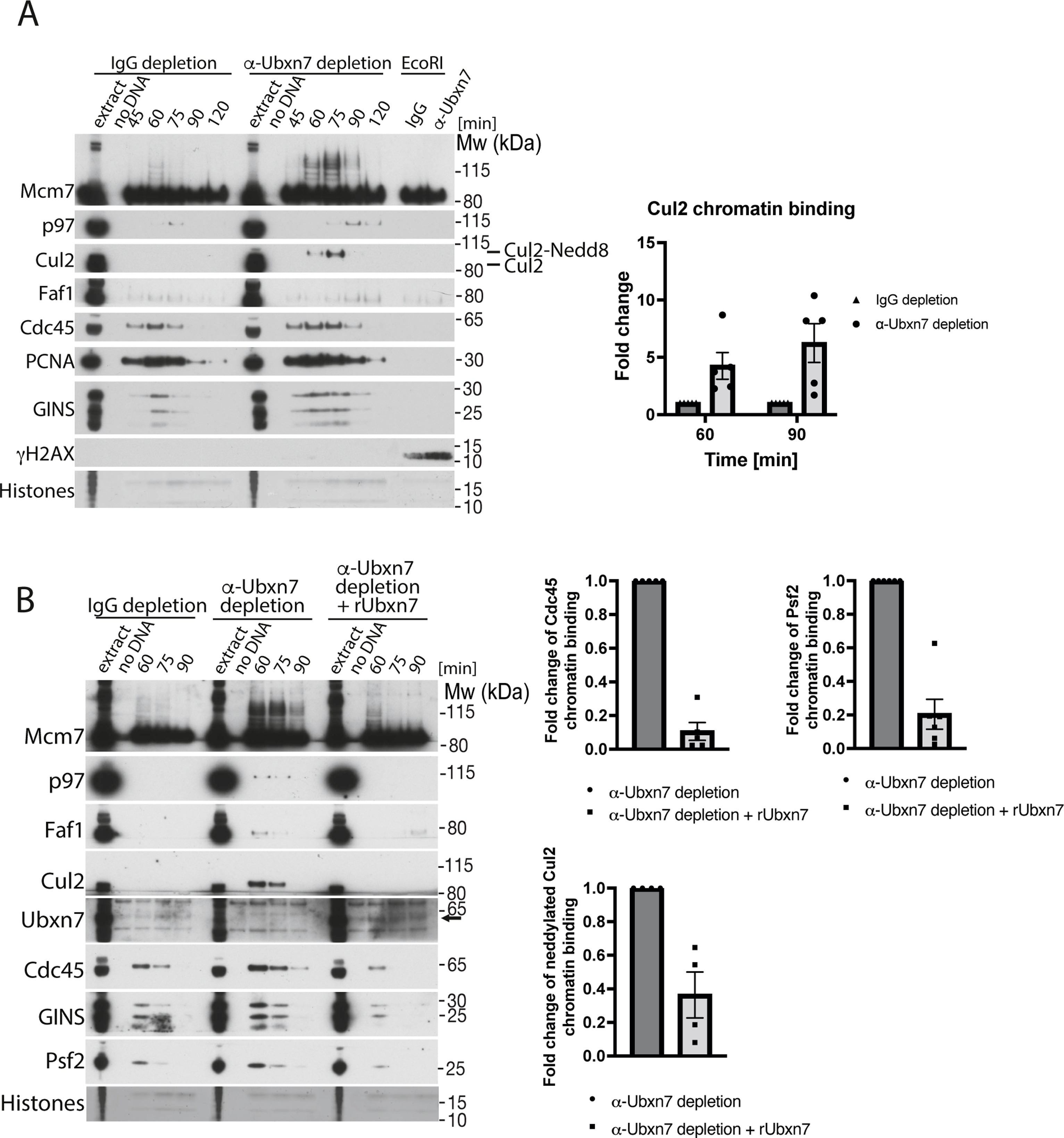 Figure 3. Ubxn7 depletion leads to accumulation of ubiquitylated Mcm7 and active Cul2Lrr1 on chromatin. (A) Chromatin was isolated during the replication reaction time course in IgG-depleted and Ubxn7-depleted extract. Chromatin samples were analysed as in Figure 1A with indicated antibodies. Representative experiment is presented (left). The fold increase of Cul2 signal on chromatin in Ubxn7 depleted extract at indicated time points was quantified in comparison to IgG depletion (n=5) (right). The mean value is presented with all individual points and with standard error of the mean (SEM) as error bars. (B) Chromatin was isolated during the replication reaction time course in IgG-depleted, Ubxn7-depleted and Ubxn7-depleted extract supplemented with recombinant Ubxn7 at 10 μg/ml. Samples analysed as in (A). Representative experiment (left). The rescue of the phenotypes by rUbxn7 was quantified in 4 experiments and the fold downregulation of CMG components and Cul2 retainment presented as a mean value with SEM (right). |