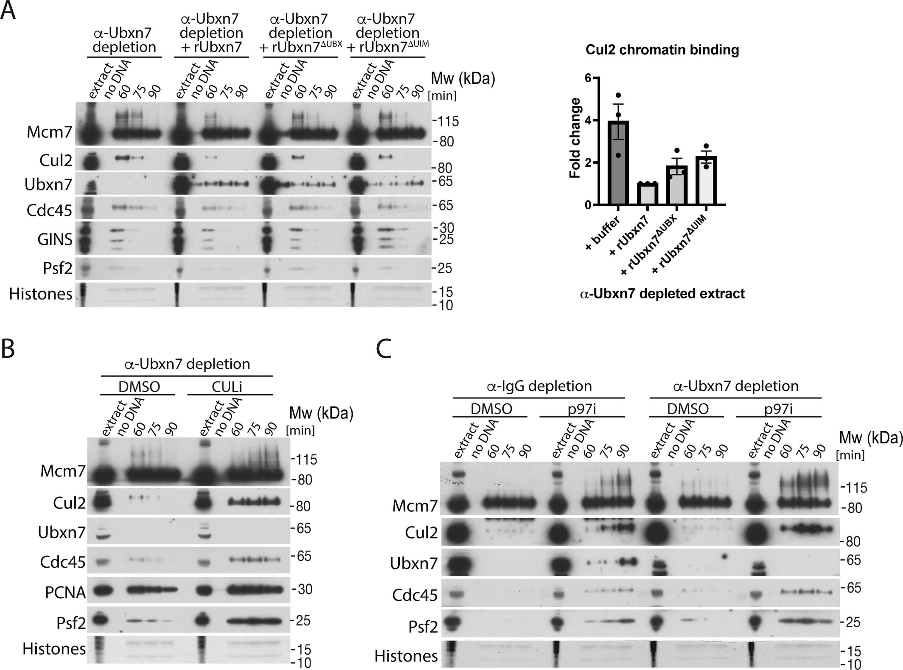 Figure 5. Ubxn7 bridges Cul2Lrr1and p97 complexes leading to efficient unloading of ubiquitylated Mcm7.A, both UIM and UBX domains of Ubxn7 are important for its functions. Ubxn7 depleted extract was supplemented with recombinant Ubxn7 or point mutants that disrupt UBX or UIM domain functions (Ubxn7ΔUBX and Ubxn7ΔUIM, respectively). Chromatin was isolated at indicated time points and analyzed as in Figure 1A. Representative experiment is presented (left). The level of Cul2 chromatin binding at 60 min time point was quantified over three experiments and the fold rescue of the Cul2 accumulation in comparison to Ubxn7 depleted extract is presented (right). Individual values, mean, and SEM are shown. CMG unloading is quantified in Fig. S6B. B, cullin activity is needed for replisome unloading in absence of Ubxn7. Ubxn7-depleted extract was supplemented with DMSO or CULi and chromatin samples isolated during the replication reaction and analyzed as in (A). C, the chains built on Mcm7 in Ubxn7 depleted extract are shorter than those built upon p97 activity inhibition. IgG- or Ubxn7-depleted extracts were optionally supplemented with p97i. Chromatin samples were analyzed at indicated time points as in (A). CMG, Cdc45, Mcm2-7 hexamer, and GINS; DMSO, dimethyl sulfoxide; UIM, ubiquitin-interacting motif. |