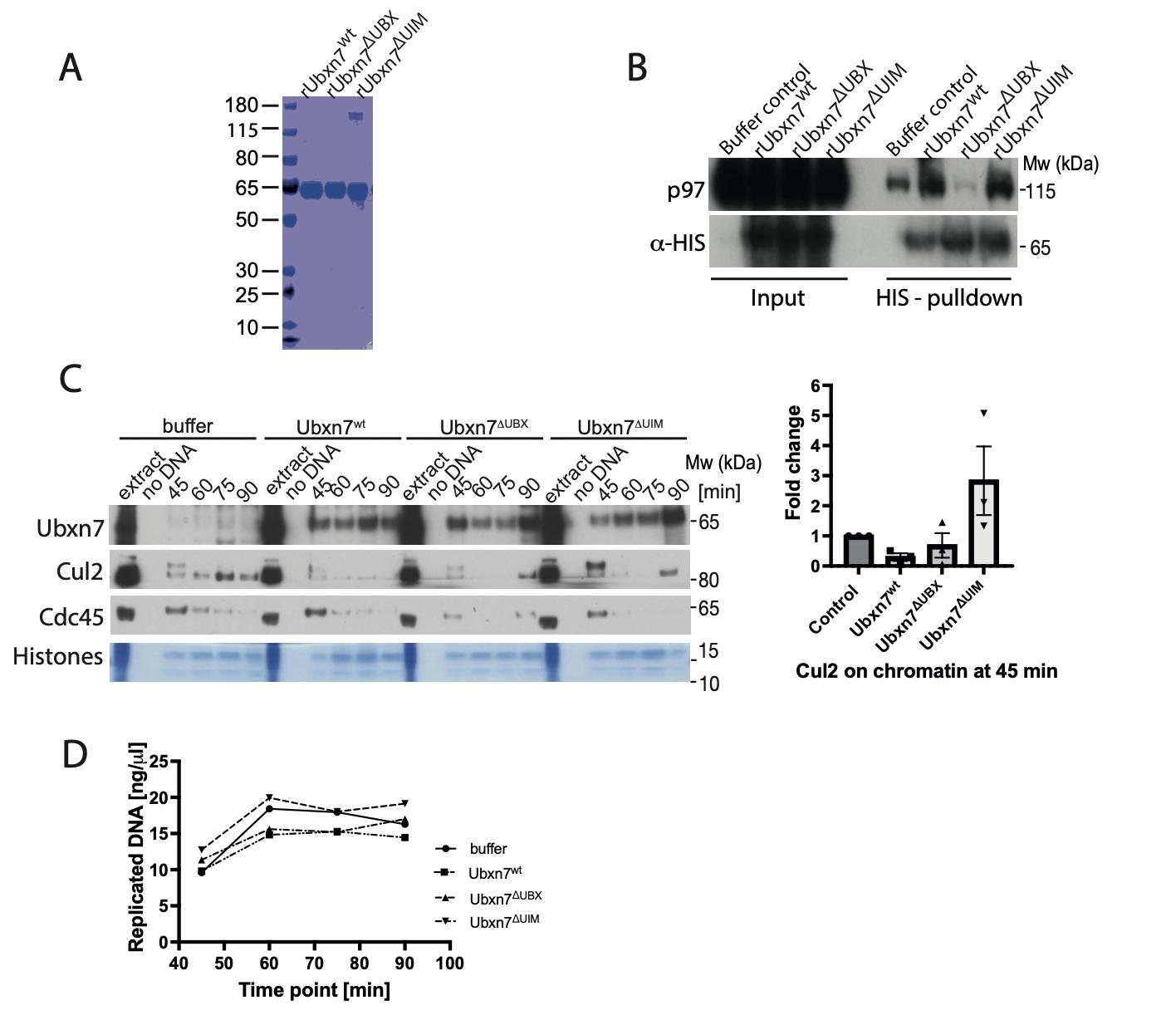 Supplementary Figure 5. (A) Recombinant 6xHIS-Ubxn7, 6xHIS-Ubxn7ÎUBX or 6xHIS-Ubxn7ÎUIM were purified and equal quantity run on a PAGE gel and stained with coomassie. (B) Ubxn7ÎUBX cannot interact with p97. Interphase egg extract was supplemented with recombinant 6xHIS-Ubxn7, 6xHIS-Ubxn7ÎUBX or 6xHIS-Ubxn7ÎUIM and the recombinant proteins were pulled out from replicating egg extract in the middle of S-phase. The ability of recombinant proteins to interact with p97 was analysed by western blotting. (C) Interphase egg extract was supplemented with Ubxn7 or mutants as in (A) and chromatin samples isolated at indicated timepoints during replication reaction. Chromatin samples were analysed by western blotting with indicated antibodies (left). The level of Cul2 bound to chromatin at 45 min of replication reaction was quantified (n=3). Fold change over buffer control is presented. Individual points, mean and SEM. (C) Addition of high concentration of rUbxn7 or its mutants to the egg extract does not inhibit egg extract ability to replicate DNA. LFB1/50 buffer or 6HIS-Ubxn7, 6HIS-Ubxn7ÎUBX or 6HIS-Ubxn7ÎUIM at 0.3 mg/ml final concenetration. Extract ability to incorporate α-32PdATP into nascent DNA was quantified. |