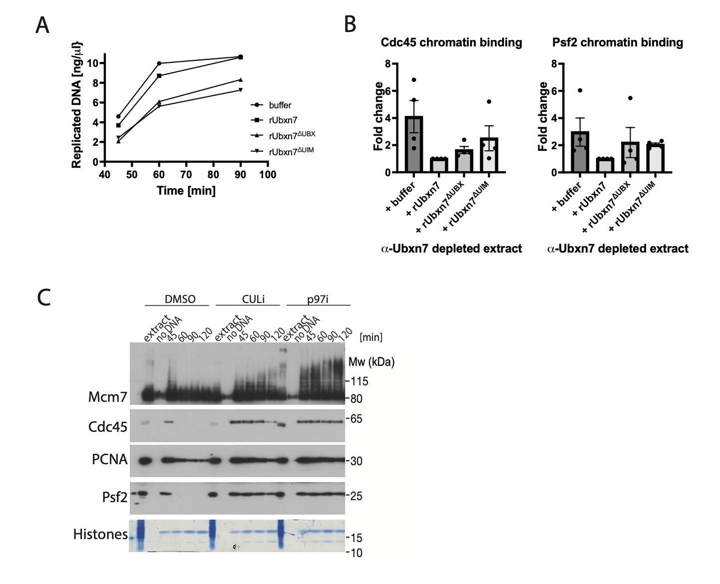 Supplementary Figure 6. (A) Addition of recombinant 6xHIS-Ubxn7, 6xHIS-Ubxn7ÎUBX or 6xHIS-Ubxn7ÎUIM to rescue Ubxn7-depleted extract does not inhibit extracts ability to synthesise DNA. Ubxn7 depleted extract was supplemented with 6xHIS-Ubxn7, 6xHIS-Ubxn7ÎUBX or 6xHIS-Ubxn7ÎUIM and extract ability to incorporate α-32PdATP into nascent DNA quantified. (B) UBX and UIM domains are needed for Ubxn7 activity. Quantification of experiment in Figure 5A. The chromatin bound Cdc45 and Psf2 at 75 min of replication reaction in Ubxn7-depleted extract supplemented with recombinant 6xHIS-Ubxn7, 6xHIS-Ubxn7ÎUBX or 6xHIS-Ubxn7ÎUIM were quantified, n=4. Individual points, mean and SEM are presented. (C) Mcm7 accumulates on chromatin modified with short ubiquitin chains upon cullin inhibition. Interphase egg extract was supplemented with DMSO, CULi (MLN4924) or p97i (NMS873) and chromatin was isolated during replication reaction at indicated time points after sperm DNA addition. Chromatin samples analysed as in Figure 1A. |