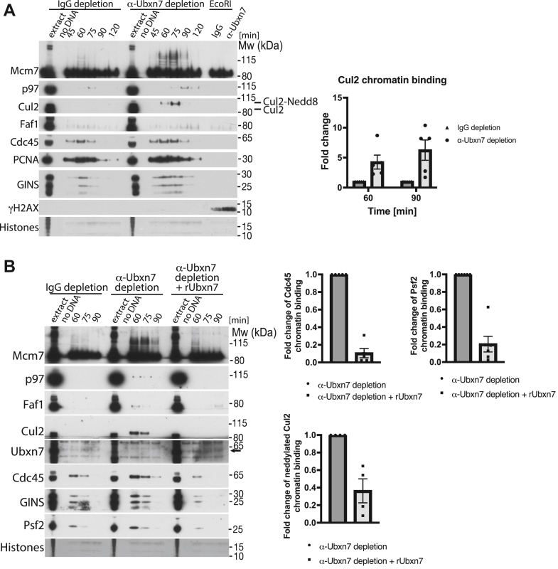 Figure 3. Ubxn7 depletion leads to accumulation of ubiquitylated Mcm7 and active Cul2Lrr1on chromatin.A, chromatin was isolated during the replication reaction time course in IgG-depleted and Ubxn7-depleted extract. Chromatin samples were analyzed as in Figure 1A with indicated antibodies. Representative experiment is presented (left). The fold increase of Cul2 signal on chromatin in Ubxn7-depleted extract at indicated time points was quantified in comparison to IgG depletion (n = 5) (right). The mean value is presented with all individual points and with SEM as error bars. B, chromatin was isolated during the replication reaction time course in IgG-depleted, Ubxn7-depleted, and Ubxn7-depleted extract supplemented with recombinant Ubxn7 at 10 μg/ml. Samples analyzed as in (A). Representative experiment (left). The rescue of the phenotypes by rUbxn7 was quantified in four experiments and the fold downregulation of Cdc45, Psf2 Cdc45 and Cul2 retainment presented as a mean value with SEM (right). |