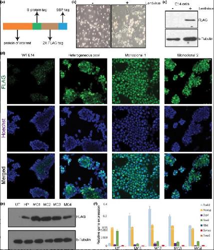 Figure 1. E14 mESCs stably expressing recombinant mFOXH1-SFB. (a) A diagram of the recombinant protein with SFB triple tags, S-protein, FLAG, and streptavidin-binding peptide (SBP) at C-terminus. (b) E14 cells transduced by lentivirus after puromycin selection. Black scale bar, 10 μm. (c) Western blot of E14 cells expressing mFOXH1âSFB recombinant proteins using anti-FLAG antibody. β-Tubulin: loading control. (d) Immunofluorescence images of mFOXH1-SFB localized to the nucleus of E14 cells. The cytosolic signals of FLAG represent background. White scale bar, 10 μm. (e) Western blot showing the protein levels of mFOXH1âSFB in control E14 (UT), heterogeneous cell pool (HP), and monoclonal lines MC1, MC2, MC3, and MC4. mFOXH1: anti-FLAG antibody; β-Tubulin: loading control. (f) RT-qPCR analyses of pluripotent and early germ layer markers in E14 mFOXH1âSFB cells. These gene expression levels were normalized to gapdh. Error bars: standard deviation values between two technical replicates
