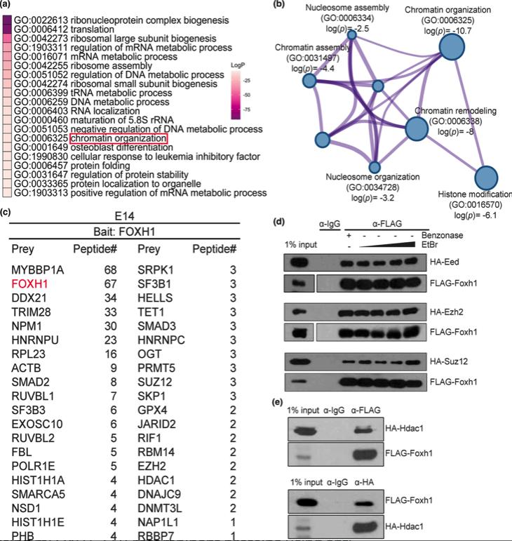 Figure 2.Foxh1 interacts with PRC2 subunits and Hdac1. (a) Gene Ontology enrichment analysis of 342 potential putative Foxh1 interacting proteins. (b) Interactome diagram illustrating Foxh1 interacting proteins in chromatin regulation in Cytoscape (Shannon et al., 2003). The sizes of circles reflect p-values. (c) The list of FOXH1 interacting proteins belonging to chromatin organization (GO:0006325), SMAD2, and SMAD3. The numbers indicate the mean of total peptides detected among three biological replicates. (d) Western blot showing the interaction between Foxh1 and PRC2 core subunits Ezh2, Eed, and Suz12 in HEK293T cells. EtBr, ethidium bromide. (e) Interaction between Foxh1 and Hdac1 in HEK293T cells