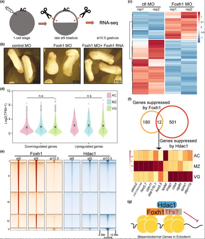 Figure 3. Mesendodermal gene suppression in the ectoderm by Foxh1âHdac1. (a) Dissection of animal cap for RNA-seq. (b) Foxh1 morphants and rescued embryos. Numbers of embryos with the representing phenotype are listed. (c) The heatmap representing differentially expressed genes in Foxh1 morphant versus control ectodermal tissues. (d) Violin plot showing the expression levels of Foxh1 regulated genes in different germ layers. AC, animal cap; MZ, marginal zone; VG, vegetal mass. (e) Clustered heatmaps depicting the genomic binding signals of Foxh1 in st8 (mid blastula), st9 (late blastula), and st10.5 (early gastrula) embryos with a 5 kb window. Signals are centered on Foxh1 peak summits. (f) Venn diagram showing genes co-repressed by Foxh1 and Hdac1 in the ectoderm. The expression levels of 12 repressed genes in each germ layers are represented in the heatmap. (g) Model of Foxh1 and other unidentified TFs recruiting Hdac1 to suppress the mesendodermal gene regulatory program in the ectoderm