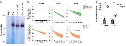 Fig. 4: Complex I is not assembled in early oocytes. a, Mitochondrial fractions solubilized in n-dodecyl-β-D-maltoside (DDM) were resolved by BN-PAGE and complex I activity was assayed by reduction of nitro blue tetrazolium chloride (NBT) in the presence of NADH. nââ¥â3 (see Extended Data Fig. 6b for quantifications). b, Spectrophotometric analysis of complex I (green, rotenone-specific activity) and complex IV (orange, KCN-specific activity) activities in mitochondrial extracts from early (stage I) and late (stage VI) oocytes and muscle. cytâc, cytochromeâc; abs, absorbance; a.u., arbitrary units. The data represent the meanâ±âs.e.m.; nâ=â3 biological replicates. c, Flavin mononucleotide (FMN) and flavin adenine dinucleotide (FAD) levels in early (stage I) and late (stage VI) Xenopus oocytes. The data represent the meanâ±âs.e.m.; nâ=â6. ***Pâ=â6.92âÃâ10â9 and **Pâ=â3.57âÃâ10â5 using two-sided Studentâs t-test with Å idákâBonferroni-adjusted P values for multiple comparisons. |