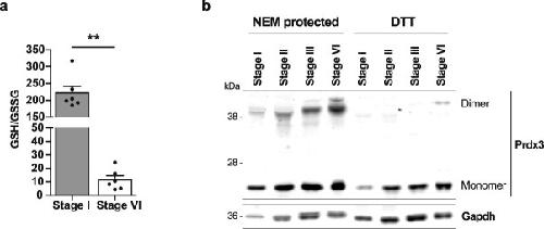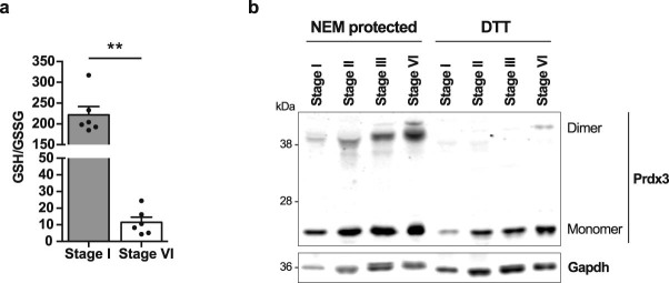 Extended Data Fig. 7. Complex I and ROS levels throughout oogenesis.a, GSH/GSSG ratio in early (stage I) and late-stage (stage VI) oocytes. The data represent the mean ± s.e.m., n=6. ** P = 1.24 × 10−6 using two-sided Student’s t-test. b, Immunoblotting of Prdx3 in early (stage I), maturing (stage II and III), and late-stage (stage VI) oocyte extracts processed in non-reducing (NEM protected) or reducing (DTT) conditions. Monomeric and dimeric Prdx3 are indicated. Gapdh was used as a loading control. One representative immunoblot from four independent experiments is shown. Source data |