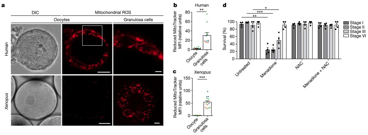 Fig. 1: Early oocytes have undetectable levels of ROS. a, Live-cell imaging of human and Xenopus early oocytes, both with attached granulosa cells. The ROS level was measured using MitoTracker Red CM-H2XRos (H2X), a reduced mitochondrial dye that does not fluoresce until it is oxidized by ROS. The boxed area is magnified in the top right image. Xenopus granulosa cells were imaged at the basal plane of the oocyte. DIC, differential interference contrast. Scale bars, 15âµm (human oocytes), 50âµm (Xenopus oocytes), 3âµm (human granulosa cells) and 10âµm (Xenopus granulosa cells). b,c, Quantification of the mean fluorescence intensity (MFI) of H2X in the oocyte and in the population of granulosa cells surrounding the equatorial plane of the oocyte for human (b) and Xenopus (c) oocytes. The data represent the meanâ±âs.e.m. of three biological replicates, shown in different colours. **Pâ=â0.0001 and ***Pâ=â4.13âÃâ10â11 using a two-sided Studentâs t-test. d, Overnight survival of oocytes at the indicated stages of oogenesis after treatment with menadione, N-acetyl cysteine (NAC) or the combination of both (see Extended Data Fig. 1j for experimental design). At least ten oocytes were incubated per condition. The data represent the meanâ±âs.e.m. across four biological replicates. *Pâ=â1.94âÃâ10â9, **Pâ=â3.77âÃâ10â18 and ***Pâ=â2.37âÃâ10â19 compared with the untreated condition using a two-sided Studentâs t-test with Å idákâBonferroni-adjusted P values for multiple comparisons. |