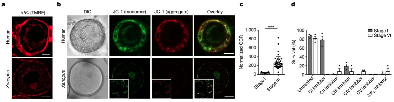 Fig. 2: OXPHOS is low, but essential, in early oocytes. a,b, Live-cell imaging of human and Xenopus early oocytes with attached granulosa cells labelled with tetramethylrhodamine ethyl ester perchlorate (TMRE) to detect mitochondrial membrane potential (ÎΨm; a) and JC-1, a membrane potential sensitive binary dye (b). Green JC-1 fluorescence is a sign of low membrane potential; red fluorescence indicates JC-1 aggregation inside mitochondria, and thus high membrane potential. The insets in the Xenopus images show granulosa cells imaged in the basal plane of the oocyte. DIC, differential interference contrast. Scale bars, 10âµm (human oocytes) and 50âµm (Xenopus oocytes). Representative images are shown (see Extended Data Fig. 2 for quantification of independent experiments). c, The basal oxygen consumption rate in early (stage I) and growing (stage III) Xenopus oocytes, normalized for total protein per sample (nâ=â17 for stage I and nâ=â43 for stage III). The data represent meanâ±âs.e.m. ***Pâ=â2.98âÃâ10â8 using a two-sided Studentâs t-test. d, Overnight survival of early (stage I) and late (stage VI) oocytes after treatments with mitochondrial poisons: complex I (CI) to V (CV) inhibitors and an ionophore (5âµM rotenone, 50âmM malonic acid, 5âµM antimycin A, 50âmM KCN, 200âµM N,Nâ²-dicyclohexylcarbodiimide (DCCD) or 30âµM carbonyl cyanide m-chlorophenyl hydrazone (CCCP), respectively). At least 50 early and 10 late-stage oocytes were incubated per condition. ÎΨm, mitochondrial membrane potential. The data represent the meanâ±âs.e.m. across three biological replicates. |