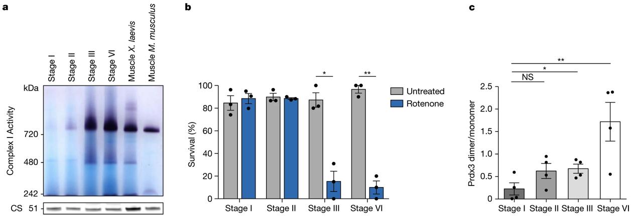 Fig. 5: Complex I and ROS levels correlate throughout oogenesis. a, Mitochondrial fractions from early (stage I), maturing (stage II and stage III) and late-stage (stage VI) Xenopus oocytes and muscle solubilized in n-dodecyl-β-D-maltoside (DDM) were resolved by BN-PAGE and complex I activity was assayed. One representative gel from three independent experiments is shown. CS, citrate synthase. b, Overnight survival of early (stage I), maturing (stage II and III) and late-stage (stage VI) Xenopus oocytes after treatment with the complex I inhibitor rotenone (5âµM). At least 10 oocytes were incubated per condition. The data represent the meanâ±âs.e.m.; nâ=â3 biological replicates. *Pâ=â0.0028 and **Pâ=â0.0002 using two-sided Studentâs t-test with Å idákâBonferroni-adjusted P values for multiple comparisons. c, Prdx3 dimer/monomer ratio assessed in oocytes in the indicated stages of oogenesis. The data represent the meanâ±âs.e.m; nâ=â4 biological replicates. NS, not significant (Pâ=â0.1128), *Pâ=â0.0376 and **Pâ=â0.0164 using two-sided Studentâs t-test with Å idákâBonferroni-adjusted P values for multiple comparisons. |