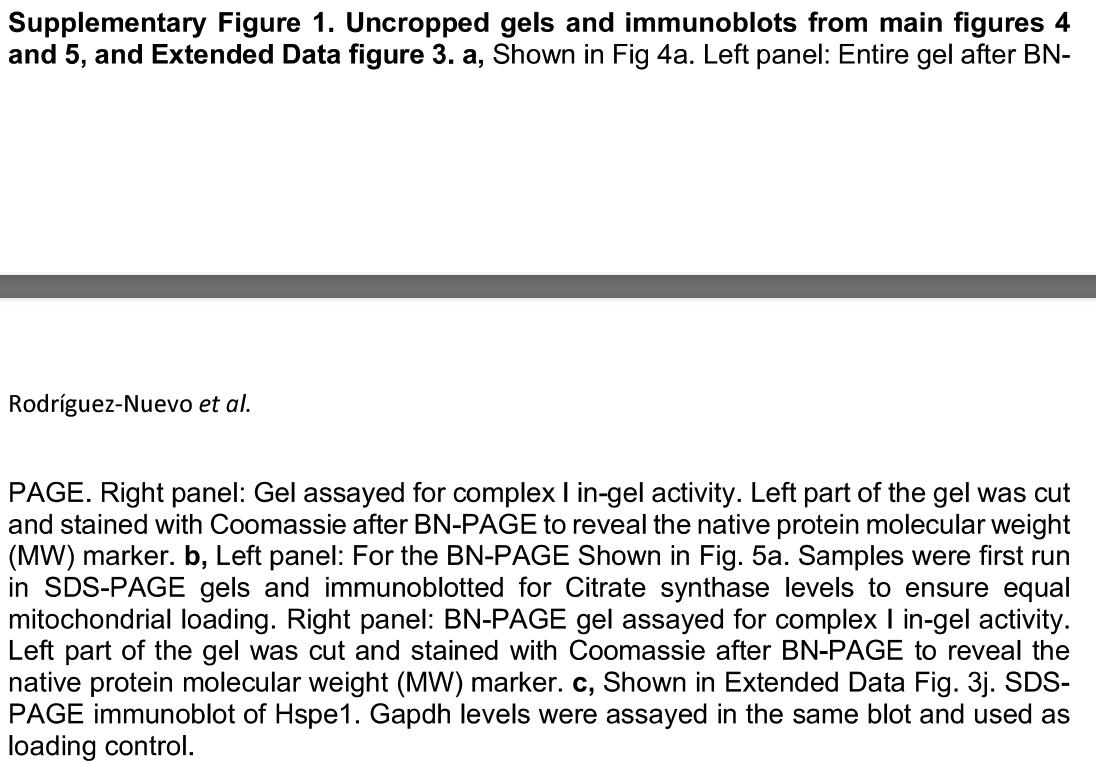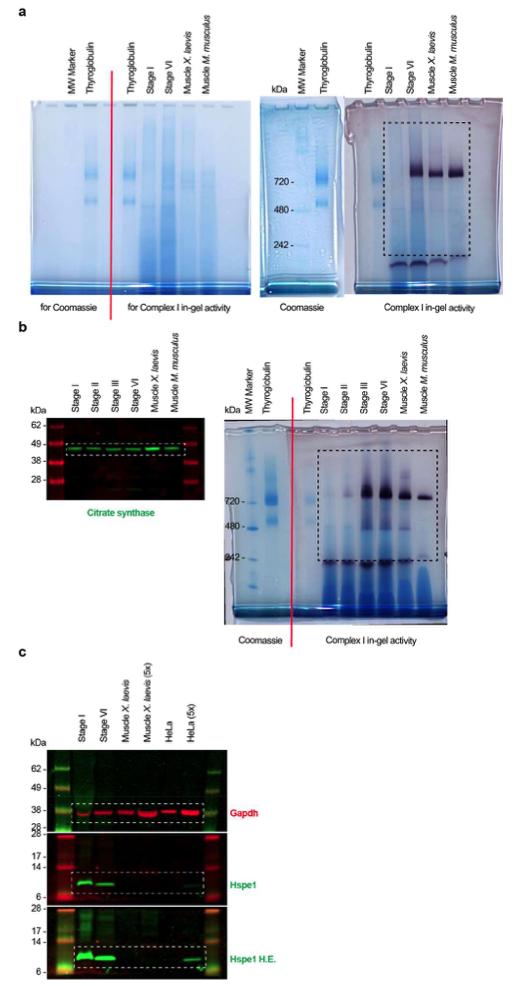 Extended Data Fig. 6. Complex I is not assembled in early oocytes.a, Fraction of the mean abundance of the indicated modules among all complex I modules in Xenopus oocytes and muscle tissue. Note that this analysis inevitably misses undetected subunits. The data represent the mean ± s.e.m. for n=3 animals. b, Quantification of reduced NBT intensity in BN-PAGE gels after complex I in-gel activity assays. The data represent the mean ± s.e.m. (n=5 for stage VI, n=4 for stage I and frog muscle, and n=3 for mouse muscle; biological replicates). *P = 0.0062, **P = 0.00046, and ***P = 1.44 × 10−4 using two-sided Student’s t-test with Šidák-Bonferroni-adjusted P values for multiple comparisons. c, DDM solubilized mitochondrial fractions were resolved by BN-PAGE followed by immunoblotting using antibodies against Ndufs1 and Atp5a1 to detect complexes I and V, respectively. Lower panels show high exposure (H.E.) blots. One representative immunoblot from three independent experiments is shown. d, SDS-PAGE and immunoblotting of mitochondrial fractions in (Fig. 4a) for complex I (Ndufs1 and Ndufb8), complex II (Sdhb) and complex V (Atp5a1) subunits, and citrate synthase as mitochondrial loading control. H.E. denotes high exposure. One representative immunoblot from three independent experiments is shown. e, Representation of excision sites for mass spectrometric identification of complex I and complex II subunits. f, Heatmap of protein abundances detected in bands excised from regions corresponding to assembled complex I, and complex II. Complex I subunits are organized by module, and # marks core subunits. Proteins that were not quantified are indicated in grey. g, Spectrophotometric analysis of citrate synthase activity in mitochondrial extracts from early (stage I), late (stage VI) oocytes and muscle. The data represent the mean ± s.e.m., n=3 biological replicates. h, i Digitonin solubilized mitochondrial fractions were resolved by BN-PAGE. Complex I (h) and complex IV (i) activities were assayed to detect supercomplexes (SC). Representative gels from three independent experiments are shown. Source data |