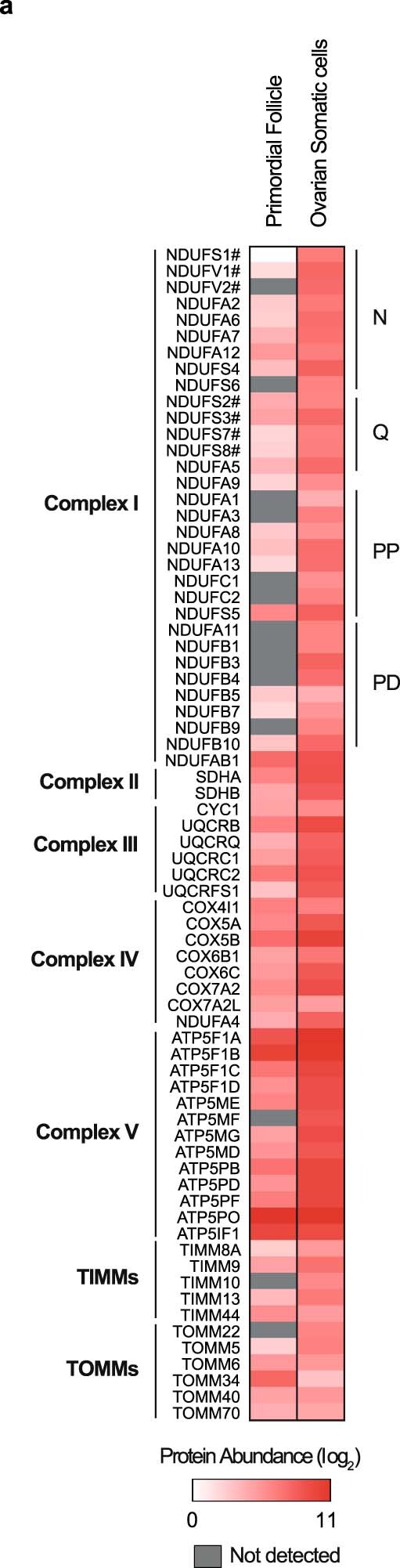 Extended Data Fig. 5. OXPHOS machinery is reduced in human early oocytes.a, Heatmap of normalized mitochondrial protein abundances in human primordial follicles and ovarian somatic cells organized by subunits of OXPHOS and mitochondrial import machinery. # marks core subunits of complex I. Proteins that were not identified are indicated in grey. |