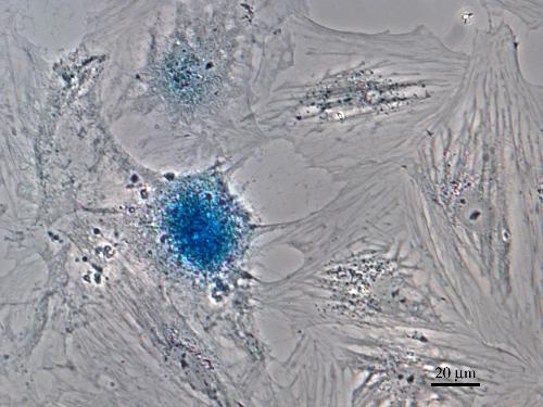 Figure 4. Expression of the senesce marker beta-galactosidase indicated by the blue colour in this phase-contrast image of XTN-12 cells initially plated at low density. Bar = 20 µm.