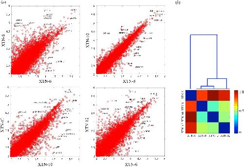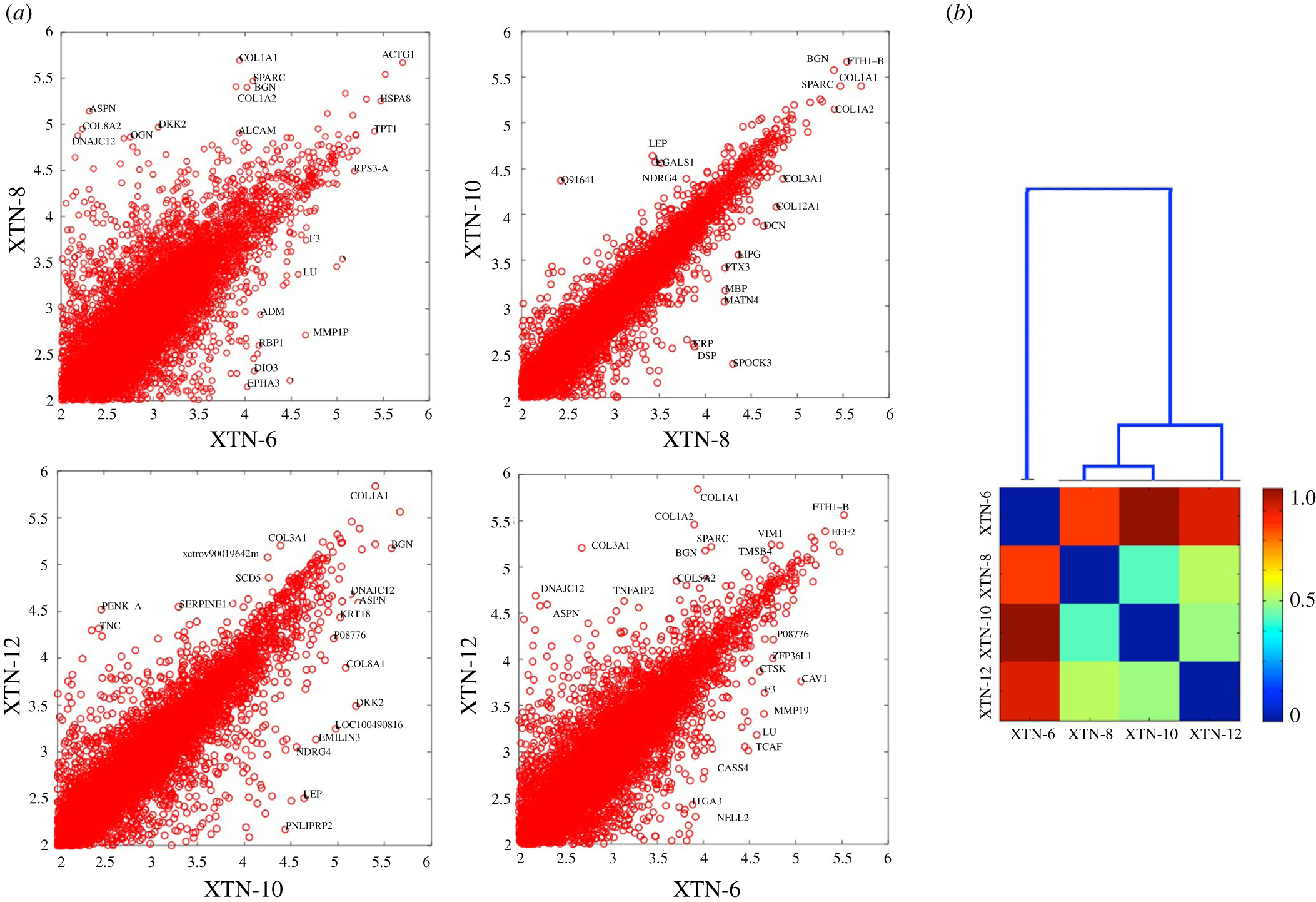 Figure 5. Comparison of gene expression in XTN cell lines. (a) Four pair-wise comparisons of gene expression in the cell lines. The most highly expressed genes and outliers are labelled using a human symbol of the homologous gene. It is apparent that XTN-8 and XTN-10 are most similar to each other and XTN-6 is most different from the rest. (b) Dendrogram and expression comparing all four cell lines. The numerical scale on the dendrogram reflects similarity matrix using a cosine distance with blue indicating greater similarity and red greater dissimilarity between pairs of lines.