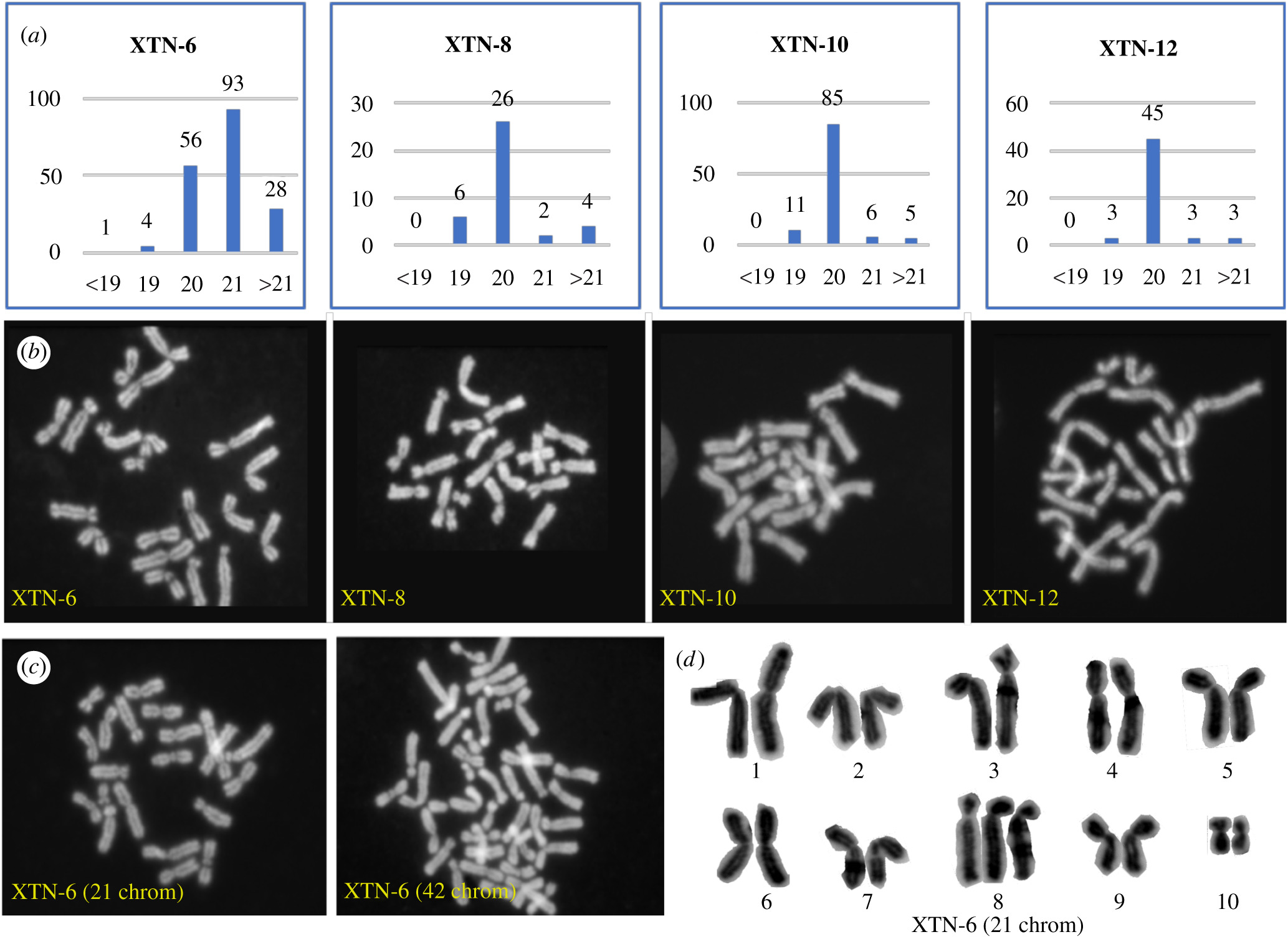 Figure 2. Karyotype analysis of four selected X. tropicalis cell lines. (a) Quantitation of chromosome spreads from XTN-6, XTN-8, XTN-10 and XTN-12 cell lines. Karyotype categories are listed on the X axis and numbers of spreads of each category are listed above the bars. (b) Examples of normal diploid spreads (20 chromosomes) from each cell line. (c) Chromosome spreads from XTN-6 cells showing single examples of 21 chromosomes, single chromosome aneuploidy and 42 chromosomes, possibly a tetraploid cell derived from a cell which originally contained 21 chromosomes. (d) An example of a karyotype analysis which revealed that XTN-6 cells with 21 chromosomes contain an extra copy of chromosome 8. (Chromosomes are numbered according to the updated nomenclature [16]).