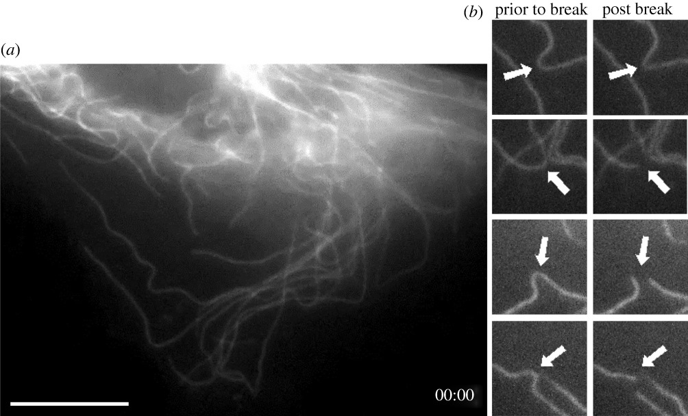 Figure 7. XTN-12 cell expressing EGFP-tubulin imaged with light-sheet microscopy. (a) Initial frame from a video centered on the retracting lamella of a moving interphase cell. (b) Four instances of microtubule breaks occurring during the video sequence. The entire sequence is available as electronic supplementary material, video S3. Bar = 10 µm.