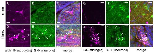 Figure 5. Evidence of phagocytic astrocytes and microglia following injury. Injured midbrains 24 h post-injury include both astrocytes (DâF) and microglia (JâL) that are positive for N-tubulin-GFP (white arrowheads), as well as for aldh1l1 (astrocytes) or IB4 (microglia); merged fluorescent signal appears white. Magenta (AâF), aldh1l1; Magenta 9 (GâL), IB4; Green, N-Tubulin-GFP; Blue, DAPI. Sham brains (AâC,GâI) contain no more than a few such cells. scale bars, 20 µm. |