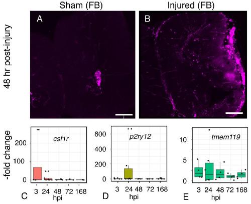 Figure 8. The microglial response to midbrain injury extends to the forebrain. Confocal images of microglia (IB4-positive cells) in sham (A) and injured (B) forebrains 48 h after injury. Microglia accumulate within the ipsilateral forebrain, at a distance from the injury site at the optic tectum (not pictured). The images are characteristic representations of all samples (n = 3). Brain sections are 50 µm thick. Scale 100 µm. (CâE), Time course of expression of microglia-associated genes following focal impact injury. RNA was isolated from sham and injured midbrains at the intervals shown; injured values are normalized to sham-treated controls. Plots show individual data points and a box showing the mean and 95% confidence intervals. N ⥠4 experiments. |