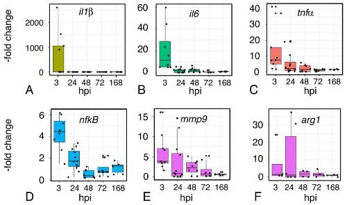 Figure 9. Time course of expression of inflammation-associated genes following injury. Quantitative RT-PCR assays for expression of the inflammatory cytokines Interleukin1-β (il1β) (A), Interleukin6 (il6) (B), Tumor Necrosis Factor-α (tnf-α) (C), as well as Nuclear Factor kB (nfkB) (D), matrix metalloproteinase 9 (mmp9) (E), and arginase (arg) (F). RNA was isolated from sham and injured midbrains at the intervals shown; injured values are normalized to sham-treated controls. Plots show individual data points and a box showing the mean and 95% confidence intervals. N ≥ 4 experiments. |