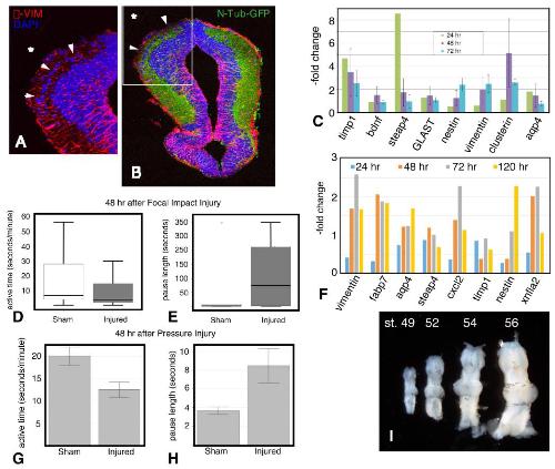 Figure A1. Initial comparisons of focal impact and pressure injury. Midbrain of a st. 48 N-tubulin-GFP tadpole 72 h after focal impact injury. Asterisks mark injured side. (A) Enlarged image of injury site; arrowheads indicate cells that have migrated into the injury area. (B) Entire section shows differences between injured and uninjured sides. Arrowheads show loss of axonal material at the injury site. Red, anti-vimentin (astrocytes and radial glia); Blue, DAPI (nuclei); Green, N-Tubulin-GFP (axons). (C) Quantitative RT-PCR of gene expression in brains from tadpoles subjected to focal impact injury shows expression profile of selected genes at 24, 48, and 72 h post-injury. Genes include markers of reactive astrocytes (timp1, steap4), astrocytes (GLAST, aqp4), radial glia (nestin), and neuroprotective genes (bdnf, clusterin). Open field assays show behavioral alterations in response to focal impact injury (D,E). (D) Comparison of active time in sham vs. injured tadpoles measured during a 10-min interval. Tadpoles were not prescreened for baseline activity. N ⥠10 tadpoles/ sample. (E) Comparison of pause duration in sham vs. injured tadpoles from the same recordings. N ⥠10 tadpoles/sample. (F) Quantitative RT-PCR of gene expression in brains subjected to pressure injury at 24, 48, 72, and 120 h post-injury. Genes include markers of astrocytes (vimentin, fabp7, aqp4, xfia2), reactive astrocytes (timp1, steap4), inflammation (cxcl2), and radial glia (nestin). Open Field assays of tadpoles subjected to pressure injury (G,H). (G) Comparison of active time in sham vs. pressure-injured tadpoles measured during a 10-min interval. Again, tadpoles were not prescreened for baseline activity. N = 50 tadpoles/sample. (H) Comparison of pause duration in sham vs. pressure-injured tadpoles from the same recordings. N = 50 tadpoles/sample. (I) Dramatic growth in brain size during the first half of metamorphosis (st. 48â56). |