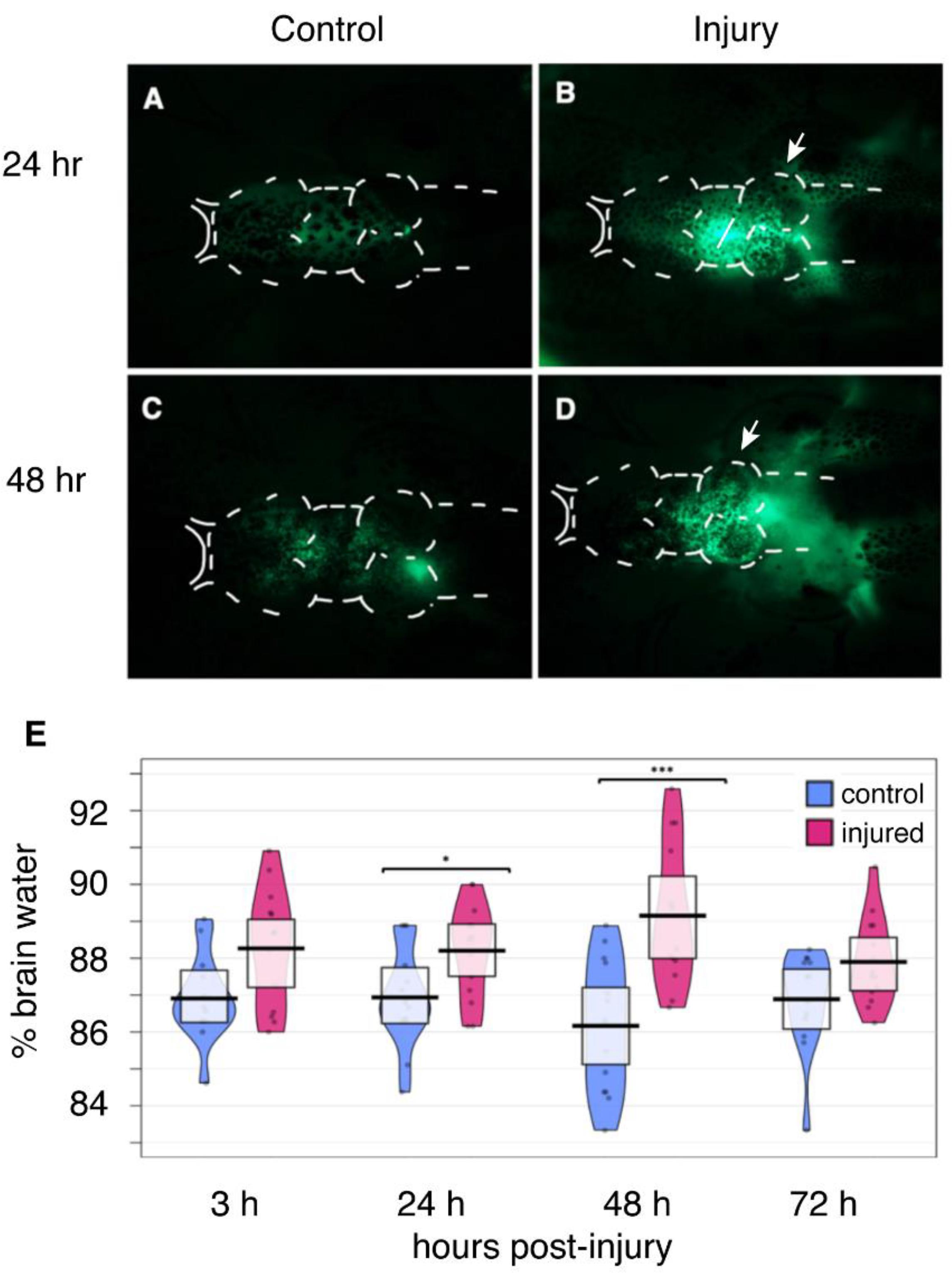 Figure 1. Focal Impact Injury leads to Edema and Disruption of BBB integrity. Sham tadpoles were anesthetized and transferred temporarily to the injury cradle prior to intraventricular injection with sodium fluorescein (NaF) either 24 h post-injury (h.p.i.) (A) or 48 h.p.i (C). Injured animals were anesthetized and then subjected to focal impact injury at the optic tectum (white arrows). Following either 24 h (B) or 48 h (D) of recovery post-injury, tadpoles were given an intraventricular injection with 10 nL of 1âμg/mL NaF; diffusion of the tracer was visualized using fluorescence microscopy. Arrows in (B,D) show the site of injury. (AâC) White dotted lines indicate the outer borders of the brain. Images are representative of n = 6 animals per treatment group for each time point. (E) * p < 0.05; *** p < 0.001. |