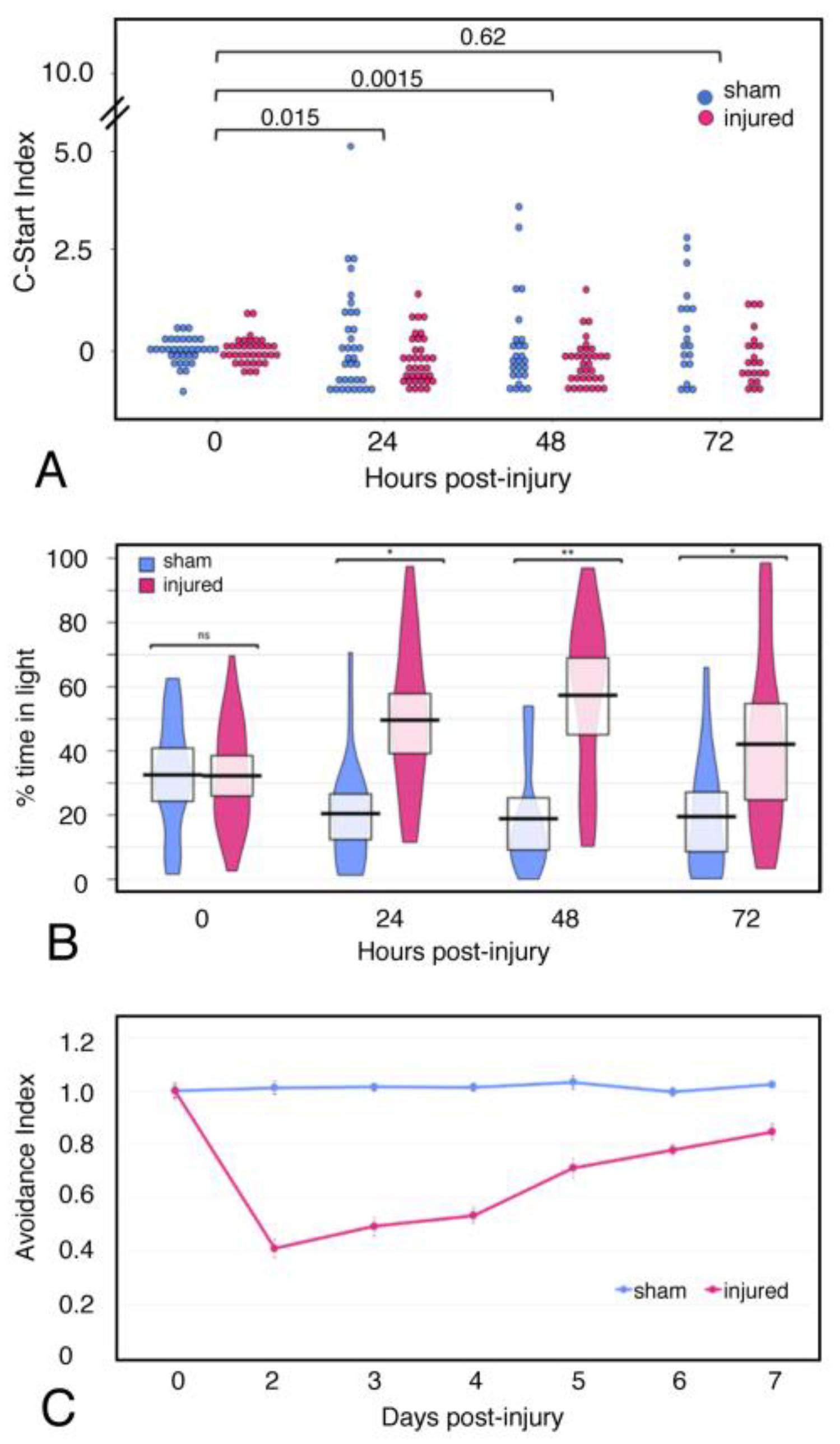 Figure 2. Focal impact injury causes deficits in visually mediated behaviors. NF stage 55 Xenopus laevis tadpoles were evaluated for baseline behavior at 0 h.p.i. in each behavioral assay, then a focal impact injury was administered to the optic tectum (OT) of each animal in the injured group (pink). Sham animals (blue) were anesthetized and moved in and out of the injury cradle after Day 0. (A) Open field testing, C-Start reflex. Open field tests were performed once per day up to 72 h.p.i. following a 0 hpi baseline. The number of C-Start reflexes performed in the injured group was significantly reduced at 24 and 48 h.p.i. (B) Light/Dark box assay. Open field tests were performed once per day up to 72 h.p.i. following a 0 hpi baseline. Light zone time was significantly increased in injured animals at all three timepoints. (C) Visual avoidance behavioral assay. Baseline data were collected at 0 h.p.i., then the injury or sham injury was administered. The test was performed daily to assess the recovery of the visual avoidance behavior. Beginning 48 h.p.i., injured tadpoles display a significant deficit in the avoidance behavior, which they appear to recover over a time course of 7 d.p.i. [Significant p-values from two-way analysis of variance (ANOVA) are shown as * pâ < â0.05, ** pâ < â0.01, n.s. indicates no significant difference]. |