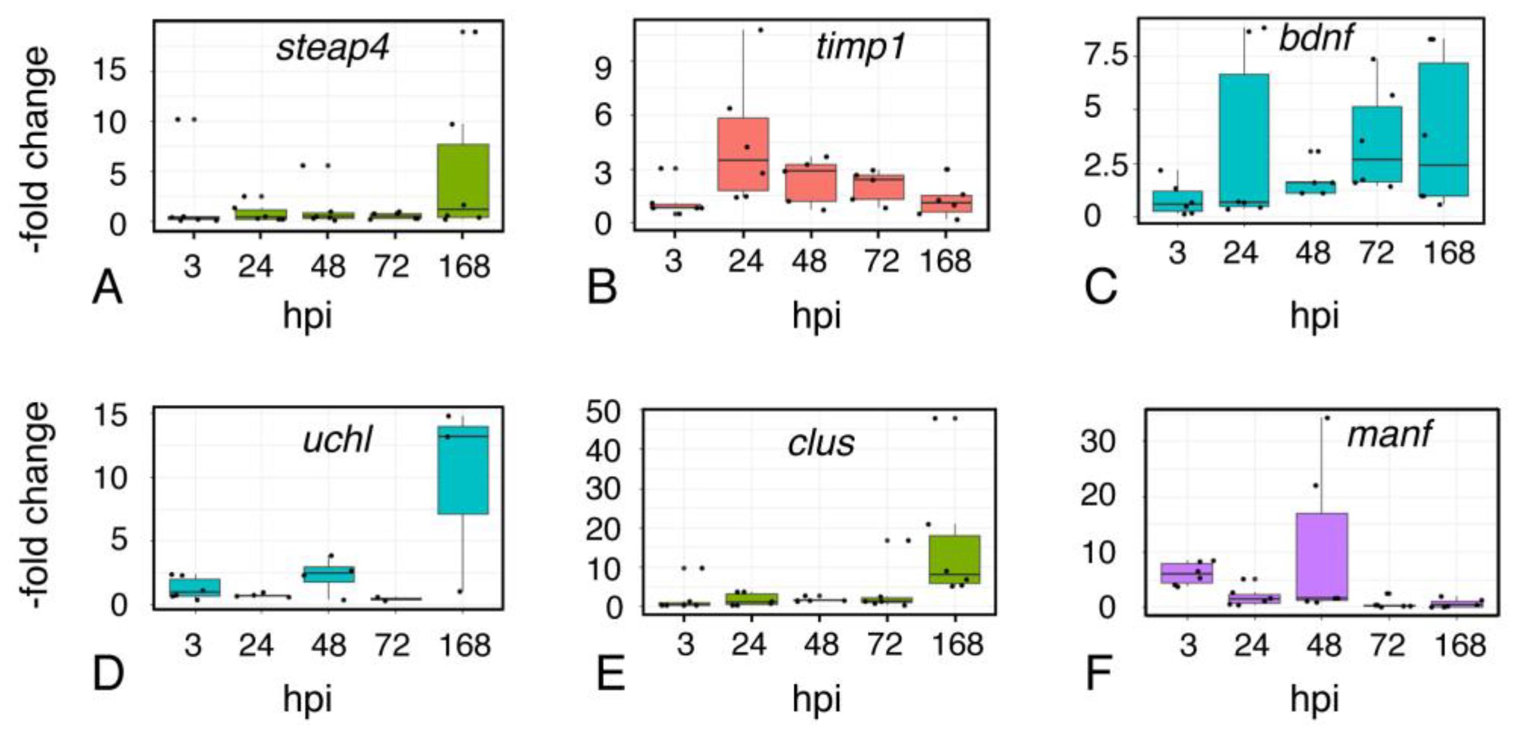 Figure 7. Expression of genes associated with astrocyte reactivity and neuroprotection. Quantitative RT-PCR assays for expression of the âreactive astrocyteâ-associated genes steap4 (A), and timp1 (B), as well as the neuroprotective genes brain-derived neurotrophic factor (bdnf) (C), ubiquitin C-terminal hydrolase-1 (uchl) (D), clusterin (clus) (E), and mesencephalic astrocyte-derived neurotrophic factor (manf) (F). RNA was isolated from sham and injured midbrains at the intervals shown; injured values are normalized to sham-treated controls. Plots show individual data points and a box showing the mean and 95% confidence intervals. n ⥠6 experiments. |