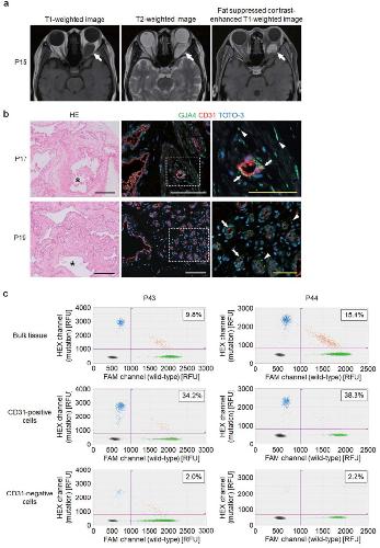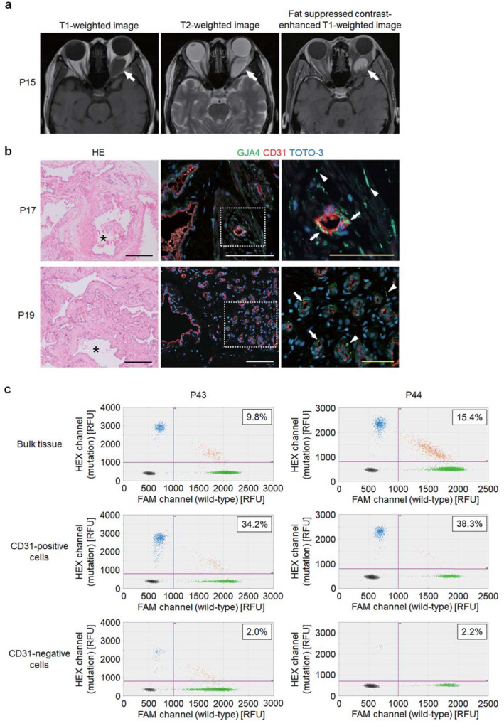 Fig. 2. GJA4 expression and GJA4 c.121G > T (p.Gly41Cys) mutation allele frequency in OCVM endothelial cells. a Representative MRI images of OCVM lesions (images of P15). b Hematoxylin and eosin (HE) staining (left) and immunostaining images for GJA4, endothelial cell marker CD31, and nuclear marker TOTO®-3 (middle and right) of sections of OCVM tissue from P17 and P19. Asterisks indicate vascular channels. White dotted lines indicate the positions of magnified panels (right). Arrows indicate GJA4 expression in endothelial cells, and arrowheads indicate GJA4 expression in non-endothelial cells. Black, white, and yellow scale bars indicate 200, 100, and 50 μm respectively. c Results of the quantification of mutation allele abundance using ddPCR in bulk tissue, CD31-positive and negative cells, from prospectively collected samples from 2 OCVMs (P43 and P44). Each dot represents a droplet, with blue being mutation positive, green being wild-type positive, and orange being positive for both. The boxed number is the fractional abundance of mutation allele in each sample