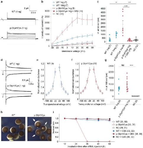 Fig. 3. GJA4 p.Gly41Cys increases GJA4 hemichannel activity. a Representative whole-cell voltage clamp hemichannel-recording of Xenopus oocytes injected with 1 ng of GJA4 WT or GJA4 p.Gly41Cys cRNA. b Intensity of hemichannel currents at the steady state plotted as a function of membrane voltage. The number of oocytes analyzed is given in parentheses. Data are shown as means ± SEM. c Comparison of hemichannel currents at a steady state of 50 mV membrane voltage. Data are shown as means ± SEM. d Representative whole-cell voltage clamp gap junction-recording of Xenopus oocytes injected with 1 ng GJA4 WT or GJA4 p.Gly41Cys cRNA. e A plot of normalized steady state junctional conductance versus transjunctional voltage (Gj–Vj plot) for GJA4 WT. The number of oocytes analyzed is given in parentheses. Data are shown as means ± SEM. f Plots of normalized steady state junctional conductance versus transjunctional voltage (Gj–Vj plot) for GJA4 p.Gly41Cys. The number of oocytes analyzed is given in parentheses. Data are shown as means ± SEM. g Comparison of transjunctional current at a steady state of 100 mV membrane voltage. Data are shown as means ± SEM. P value was calculated using a two-tailed t test. h Images showing the deleterious effect of GJA4 on oocytes (arrows) injected with GJA4 c.121G > T (p.Gly41Cys) compared with GJA4 WT 36 h after cRNA injections. i Plots of survival rates of oocytes injected with GJA4 WT and c.121G > T (p.Gly41Cys). The number of oocytes analyzed is given in parentheses. The averages of two replicated experiments were plotted. P values were calculated using a two-tailed t test. NS not significant; *p < 0.05; **p < 0.01; ***p < 0.001; ****p < 0.0001