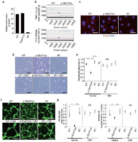 Fig. 4. GJA4 p.Gly41Cys dysregulates endothelial cell-function, which is rescued by a connexin inhibitor. a qPCR analyses of GJA4 mRNA in HUVECs transfected with GJA4 WT or GJA4 c.121G > T (p.Gly41Cys). b ddPCR analysis of GJA4 cDNA in HUVECs transfected with GJA4 WT or GJA4 c.121G > T (p.Gly41Cys). Each dot represents a droplet, with blue being mutation positive, and green being wild-type positive. c Immunostaining for FLAG and nuclear marker DAPI of HUVECs transfected with GJA4 WT-FLAG, GJA4 c.121G > T (p.Gly41Cys)-FLAG, or normal control. Scale bars, 15 μm. d Representative image of HUVECs transfected with GJA4 WT, GJA4 c.121G > T (p.Gly41Cys), or normal control, and efficacy of CBX. Scale bars, 50 μm. e Quantification of cell viability of HUVECs transfected with GJA4 WT, GJA4 c.121G > T (p.Gly41Cys), vector control, and normal control using the MTT assay. f Representative images of tube formation assay of HUVECs transfected with GJA4 WT, GJA4 c.121G > T (p.Gly41Cys), or normal control, and the efficacy of CBX. Scale bars, 200 μm. g Quantification of tube formation in HUVECs transfected with GJA4 WT, GJA4 c.121G > T (p.Gly41Cys), and normal control by total mesh area (left) and number master junctions (right). P values were calculated using a two-tailed t test. NS, not significant; *p < 0.05; **p < 0.01; ***p < 0.001; ****p < 0.0001