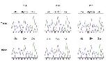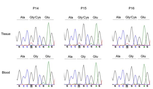 Fig. S2 Sanger sequencing chromatograms showing GJA4 sequences of 3 OCVM participants in the discovery cohort. Each curve represents a trace of a signal intensity; black, blue, green, and red represent G (guanine), C (cytosine), A (adenine), and T (thymine), respectively. Boxed characters represent nucleotides at the position of the GJA4 mutation (c.121G>T). Upper and lower columns show chromatograms of tissue samples and blood samples, respectively. Participant IDs are shown above. Amino acid sequences are shown above each chromatogram