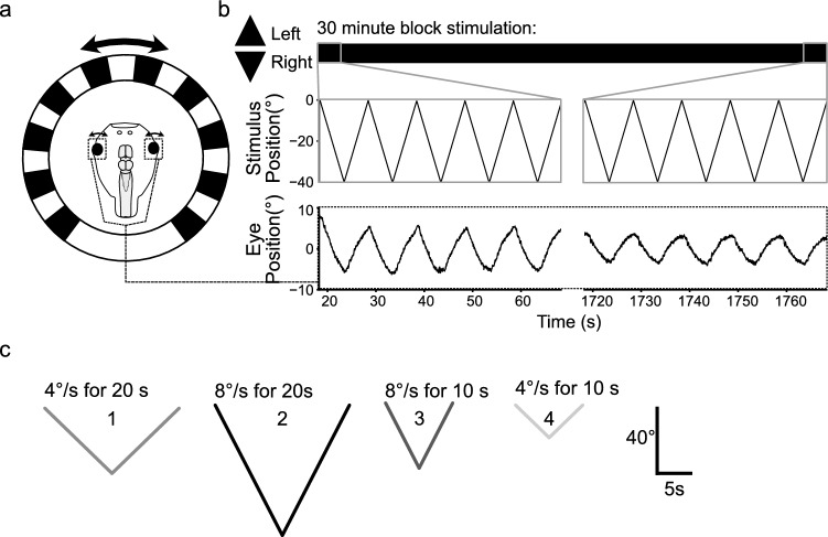 Fig. 1. Stimulation and recording of the optokinetic reflex in semi-intact preparations of Xenopus laevis tadpoles. a Schematic illustrating the experimental setting with a Ringer-filled circular recording chamber hosting the preparation; horizontal motion of vertical black and white stripes across the surrounding cylindrical screen serves as large-field visual motion stimulus and elicits eye movements (double arrows). b Representative example of horizontal positional oscillations of the eyes (lower trace) during prolonged (30 min) visual motion stimulation (upper traces), at the onset (left) and the end of the training period (right). c Single cycles of visual image motion profiles depicting the different combinations of stimulus velocities of either 4°/s (1, 4) or 8°/s (2, 3), presented in bidirectional alternation with a cycle duration of either 20 s (1, 2) or 10 s (3, 4)