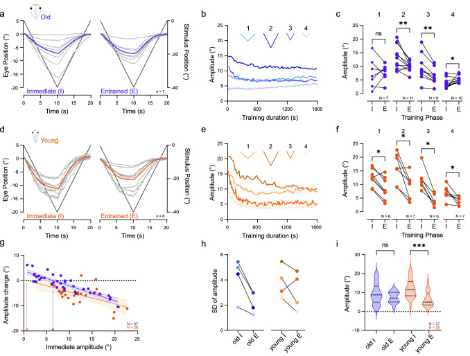 Fig. 2. Ontogeny of OKR plasticity. a–f Differential effects of prolonged visual image motion in old (a–c) and young (d–f) larvae; individual eye motion cycles (gray traces) and population average (colored traces, n = 7 (old, a), n = 8 (young, d) at the onset (left) and the end (right) of prolonged visual motion stimulation with profile 1 (velocity: 4°/s, cycle duration: 20 s; see 1 in Fig. 1c); population-averaged response amplitudes across 30 min of training (b, e), measured on a per-cycle basis for stimulus paradigms 1–4, respectively; mean response of five cycles (c, f) obtained immediately (I) and at the end of the 30-min OKR entrainment (E) on a per-animal basis for stimulus paradigms 1–4 (performed on different, independent sets of naïve tadpoles, respectively; see Fig. 1c). g Amplitude changes plotted against immediate OKR amplitudes for old (blue) and young (orange) tadpoles; solid lines indicate linear regression fit to data; shaded areas indicate 95% confidence interval of the fit; horizontal dotted line indicates no amplitude change; dots above indicate OKR amplitude increase, dots below OKR amplitude decrease; blue (old tadpoles) and orange (young tadpoles) vertical dashed arrows indicate the theoretical initial amplitudes, above or below which a decrease or increase is expected. h Standard deviation (SD) of the averaged response amplitudes immediately (I) and at the end of the entrainment period (E) for old and young tadpoles and stimulus paradigms 1–4 (for color-code see b, e). i Violin plots of immediate (I) and entrained response amplitudes (E), in young and old tadpoles respectively, pooled across stimulation paradigms 1–4
