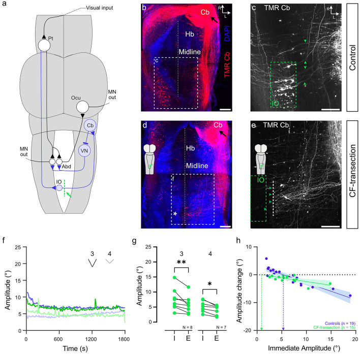 Fig. 3. Anatomical and functional consequences of climbing fiber transection. a Schematic of a Xenopus tadpole brain depicting the direct (black) and indirect (blue) OKR pathways for eliciting a horizontal OKR during rightward motion stimulation of the right eye; the site of climbing fiber transection in the caudal hindbrain is indicated by the green dashed line. b–e Whole-mount confocal reconstructions of the hindbrain (Hb) of a stage 55 control tadpole (b–c) and after midline transection (d–e) at the level of the caudal hindbrain (green line in a, scheme in d) counterstained with DAPI (blue nuclei); unilateral cerebellar injections of Tetramethylrhodamine (TMR; black arrows), outlined the climbing fiber (CF) axonal pathway (green arrow heads in c, e) and parent inferior olivary cell bodies in the contralateral ventral hindbrain in controls (b) and lack thereof after the lesion (* in d), illustrated at higher magnification in c, e (green dashed rectangles); f Population-averaged response amplitudes across 30 min of training, measured on a per-cycle basis for stimulus paradigms 3 and 4, in controls (blue) and after CF transection (green). g Mean response of five cycles obtained immediately (I) and at the end of the 30-min OKR entrainment (E) on a per-animal basis for stimulus paradigms 3 and 4 (see Fig. 1c) in CF-transected animals. h Amplitude changes plotted against immediate OKR amplitudes for controls (blue) and CF-transected animals (green); solid lines indicate linear regression fit to data, and shaded area the 95% confidence interval of the fit; horizontal dotted line indicates no amplitude change; dots above the line indicate amplitude increase, dots below amplitude decrease. Blue (control tadpoles) and green (CF-transected tadpoles) vertical dashed arrows indicate the theoretical initial amplitudes, above or below which a decrease or increase is expected. Abd abducens nucleus, Cb cerebellum, D dorsal, IO inferior olive, L lateral, MN motoneurons, Ocu oculomotor nucleus, Pt pretectum, R rostral, VN vestibular nuclei. Scale bars in all panels represent 100 µm