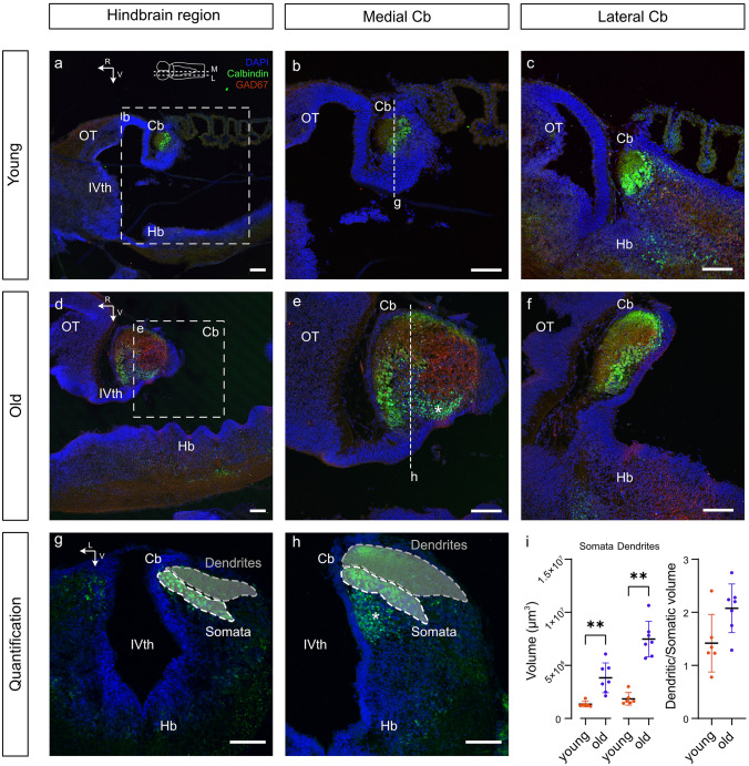 Fig. 4. Ontogenetic plasticity of calbindin- and glutamate-decarboxylase (GAD67)-immunopositive cerebellar structures. a–f Parasagittal sections at two medio-lateral planes (see scheme on top in a) through the hindbrain (Hb) depicting calbindin- (green) and GAD67-labeled (red) and DAPI-counterstained (blue) morphological structures in young (a–c) and old tadpoles (d–f); medially (M in scheme on top in a) located sagittal sections depicting overviews (a, d) and higher magnifications (b, e) of calbindin- and GAD67-immunopositive structures in the hindbrain and cerebellum (Cb); laterally (L in scheme on top in a) located sagittal sections (c, f) depicting respective immunopositive elements in the lateral cerebellum of young (c) and old (f) tadpoles. g, h Coronal sections at the level of the cerebellum of young (g) and old (h) tadpoles, outlining the region used to measure the location of Purkinje cell (PC) somata (white) and the extension of the dendritic tree (gray). i Quantification of the volumes of Purkinje cell somata (left), dendritic tree (middle) and ratio of dendritic tree/Purkinje cell somatic volumes (right) in young and old tadpoles. OT optic tectum, R rostral, V ventral, IVth fourth ventricle. Scale bars in all panels represent 100 µm