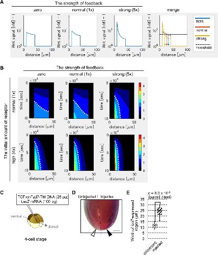 Figure 3. Feedback regulation of fzd7 expression restricts the Wnt signal active region. (A) Wnt-dependent expression of fzd7 increased Wnt signal activity near the Wnt source and decreased Wnt signal activity far from the source, making a steep gradient. An example of the threshold of Wnt signal activity to determine the edge of Wnt-signal-active region is shown by a dashed line (merge). Arrows show the edge of the activated region in each condition. âstrongâ means 5-times higher strength of feedback than ânormalâ. These figures correspond to a column in Figure 3âfigure supplement 1B (âthe initial amount of receptor = normalâ). (B) Heatmap of Wnt signaling activity. The y-axis represents time elapsed from top to bottom (Figure 3âfigure supplement 3 for the detail). The dotted line shows an example of temporal changes of the edge of the Wnt-signal-active region. The line became nearly vertical under strong feedback with a ânormalâ initial amount of receptor, indicating that a system with strong feedback quickly reaches a steady state. In the presence of high initial expression (4-times higher than the ânormalâ), the slope of contour was nearly perpendicular, even without feedback. These figures correspond to a column in Figure 3âfigure supplement 4A (âthe initial amount of receptorâ = ânormalâ or â4 timesâ). (C) TCF-dnFzd7-TM plasmid (25 pg) was injected into the marginal region of a dorsal blastomere at the four-cell stage with a tracer, LacZ mRNA (100 pg). (D) In situ hybridization using a fzd7 intracellular domain probe. The probe recognizes the intracellular domain of fzd7, which the dominant negative fzd7 lacks. Thus, it visualizes endogenous expression of full-length fzd7 (pericardium region), or the Wnt signal active region. The fzd7 expression area, or Wnt signal active region, was expanded (arrowhead) by injection of TCF-dnFzd7-TM plasmids, as quantified in E. (E) A box plot of the width of fzd7-expressing region in the uninjected side (open arrowhead) and the injected side (arrowhead). The horizontal line indicates the median. Edges of boxes indicate the first and third quartiles. The cross indicates the mean, and whiskers indicate the minimum and maximum (n=14 each). |