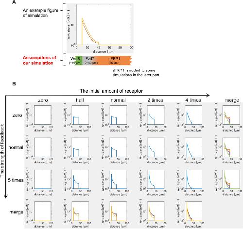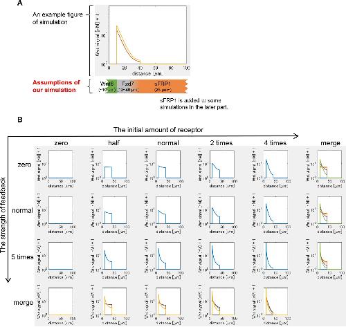 Figure 3-figure supplement 1. Mathematical modeling of Wnt signaling activity in the heart region. (A) Design of mathematical modeling. An example of Wnt signaling activity is shown in the graph. We assumed that (i) Wnt6 is expressed from the left side (and sFRP1 from the right side), (ii) the initial expression of Fzd7 is set in the middle region (30 μm width (10~40 μm from the left end in the figure)) according to the observation of Xenopus embryos (Figure 1âfigure supplement 1B), (iii) the distribution of N-acetyl HS is the same as that of Fzd7, (iv) sFRP1 is expressed at >25 μm as suggested by the expansion of sFRP1 expression in the myocardium region in the wnt6-knocked-down embryos (Lavery et al., 2008b). (B) Wnt signaling activity in various settings of the receptor amount was shown at t=tmax = 105 sec (~1 day after the onset of the simulation). The Wnt-independent initial amount of receptor increases toward the right, and the strength of feedback (the receptor amount is Wnt-dependent) increases toward the bottom. In the merged figure, each line from different settings was displayed with different colors. |