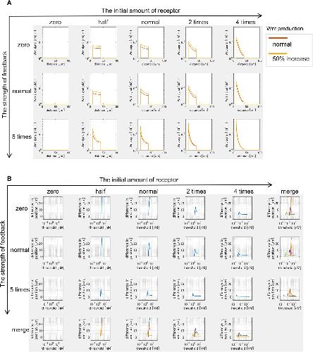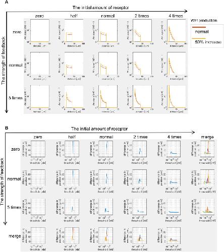 Figure 3—figure supplement 5. Time changes of free ligand amount without sFRP1 (A) or with sFRP1 (B).The amount of free ligand was higher with low initial amount of receptor and no feedback. However, with the feedback, the amount was gradually reduced. |