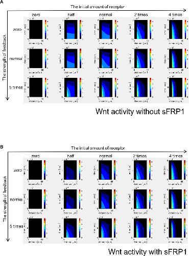 Figure 3-figure supplement 6. Time changes of free receptor amount without sFRP1 (A) or with sFRP1 (B). Changes of the amount of free receptor shows patterns similar to those of Wnt signal activity (Figure 3âfigure supplement 4). |