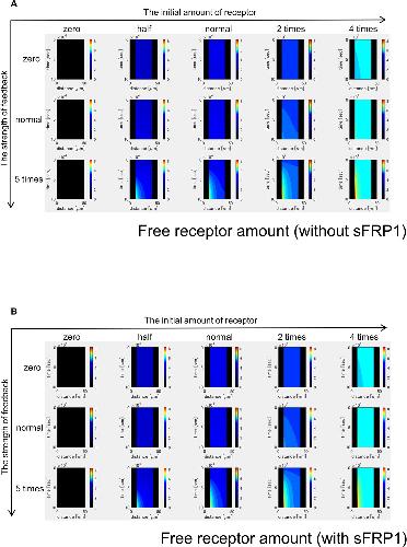 Figure 3-figure supplement 5. Time changes of free ligand amount without sFRP1 (A) or with sFRP1 (B). The amount of free ligand was higher with low initial amount of receptor and no feedback. However, with the feedback, the amount was gradually reduced. |