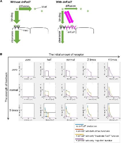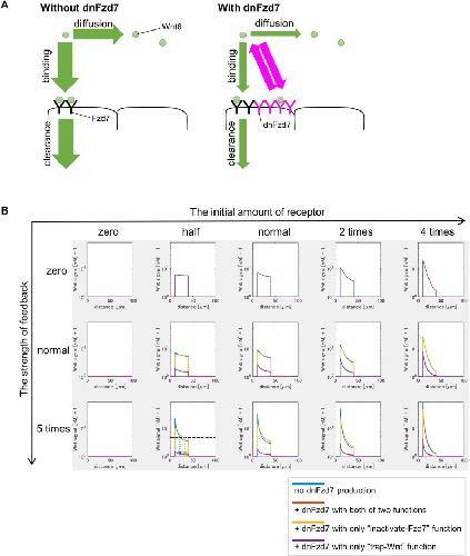 Figure 3-figure supplement 8. dnFzd7 with only âtrap-Wntâ function does not expand Wnt-signal-active region but dnFzd7 with only âinactivate-Fzd7â function does. (A) Schematic figure shows that âtrapperâ prevents Wnt from diffusing and being degraded at the same time. Circle represents Wnt6. âYâ represents receptors (black, Fzd7; magenta, âtrapperâ (dnFzd7 with only âtrap-Wntâ function)). Arrows represent events (Wnt binding to the receptor, Wnt clearance, Wnt diffusion). Magenta arrows represents the rate of Wnt binding to the trapper or Wnt dissociation from the âtrapperâ. The width of the arrows indicates the rate of these events. Without the âtrapperâ (left panel), Wnt binds to Fzd7 or diffuses. The âtrapperâ (right panel) binds to Wnt, and consequently inhibits Wnt clearance and diffusion at the same time. Thus, dnFzd7 that only has âtrap-Wntâ function does not promote Wnt diffusion. (B) dnFzd7 with only âtrap-Wntâ function greatly reduced Wnt signaling level but dnFzd7 with only âinactivate-Fzd7â function expanded the signaling range. Wnt signaling activity was shown at t=tmax = 105 s (~1 day after the onset of the simulation). The initial amount of receptor increases toward the right, and the strength of feedback increases toward the bottom. Each colored line indicates Wnt signal activity with/without dnFzd7 of various types (blue, no dnFzd7 production; orange,+dnFzd7 with both of two functions; yellow,+dnFzd7 with only âinactivate-Fzd7â function; purple,+dnFzd7 with only âtrap-Wntâ function). However, when âthe strength of feedbackâ is zero, dnFzd7 is not expressed. Thus, all lines with/without dnFzd7 showed the same results in the top panels. When âthe strength of feedbackâ was greater than zero (especially when âthe initial amount of receptorâ was smaller), dnFzd7 with only âinactivate-Fzd7â expanded the Wnt signal active region. In the panel of âthe initial amount of receptor = halfâ and âthe strength of feedback = 5 timesâ, we showed an example of threshold of Wnt signal activity to determine the edge of Wnt-signal-active region (shown by a dashed line), and the arrows show the edge of the activated region in each condition. dnFzd7 with both of the two functions does not expand the Wnt signal active region, indicating that dnFzd7 in wet experiment should have lower Wnt affinity than Fzd7. |