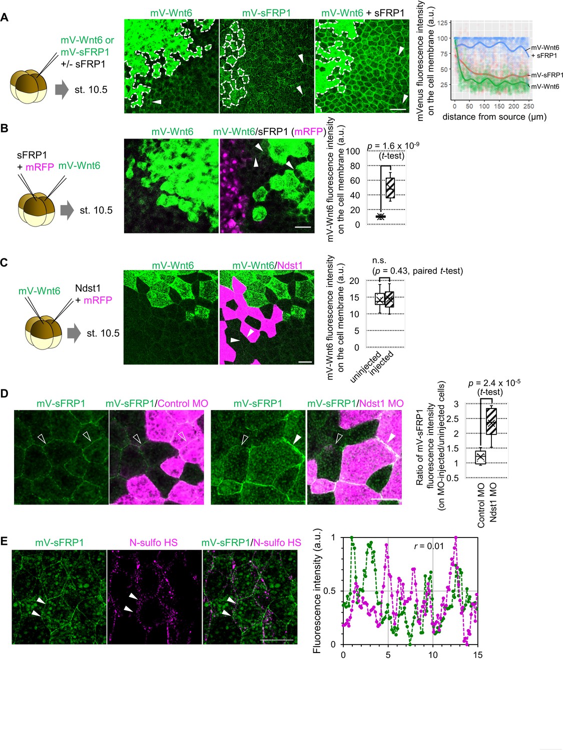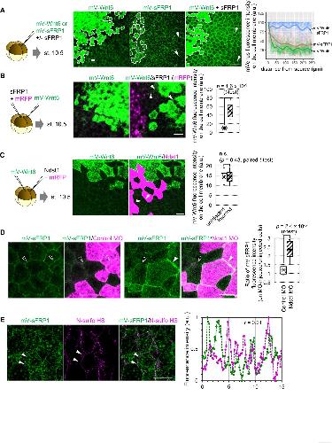 Figure 4-figure supplement 1. Distribution and function of sFRP1. (A) sFRP1 can lengthen the distributional range of Wnt6. mV-Wnt6 with/without sFRP1 or mV-sFRP1 was injected into a ventral blastomere at the four-cell stage and observed at st. 10.5. Cells surrounded by dotted line are the source cells. Wnt6 distributional range was seemed to be short, whereas sFRP1 was long. To examine this, mVenus fluorescence intensity on the cell membrane was measured (n=3 each). The intensity was normalized by setting the maximum intensity within 5 μm near the source as 100. Dots indicate each value, and regression curves were fitted (calculated by geom_smooth function in ggplot2 package version 3.3.5 in R version 4.1.0). Wnt showed a steeper gradient and sFRP1 showed a shallower gradient. mV-Wnt6 intensity on the cell membrane was increased by sFRP1. (B) The distribution of Wnt6 on the cell membrane was enhanced by sFRP1, which was expressed even at a distance from Wnt6 source. mV-Wnt6 and sFRP1 were injected into different blastomeres, different from A. mVenus intensity on the cell membrane around the source was measured as in the box plot (n=13 (mV-Wnt6), 11 (mV-Wnt6+sFRP1)). When mV-Wnt6 was injected, the distribution on the cell membrane other than the source cell was not clearly observed. The distribution can be seen when sFRP1 was injected (arrowheads). (C) Wnt6 was not substantially accumulated on ndst1-expressing cells. Indicated mRNAs were injected into different blastomeres at the four-cell stage. ndst1 was expressed in magenta-colored cells. Averaged fluorescence intensity of mVenus on lines along cell membrane of uninjected and injected cells was measured and shown in the box plot (n=12 each). The fluorescence intensities were not significantly different between on ndst1-injected and uninjected cells. (D) sFRP1 was highly accumulated on ndst1-knocked-down cells. mV-sFRP1 mRNA and ndst1 MO (with a tracer, TMR) were injected different blastomeres at the four-cell stage. Averaged fluorescence intensity of mVenus on lines along cell membrane was measured on neighboring cells of MO-injected and uninjected cells. Ratio of them was shown in the box plot (n=8, 9, respectively). (E) sFRP1 was not localized on N-sulfo-rich HS. An example figure for Figure 4D. mV-sFRP1 mRNA was injected into one blastomere at the four-cell stage. N-sulfo-rich HS was visualized by IHC. Signal intensity was showed in the graph, which was measured between two arrowheads (green, mV-sFRP1; magenta, N-sulfo-rich HS). Pearsonâs correlation coefficient (r) was shown in the graph. Scale bar: 50 μm (A, B), 30 μm (C, D, E). |